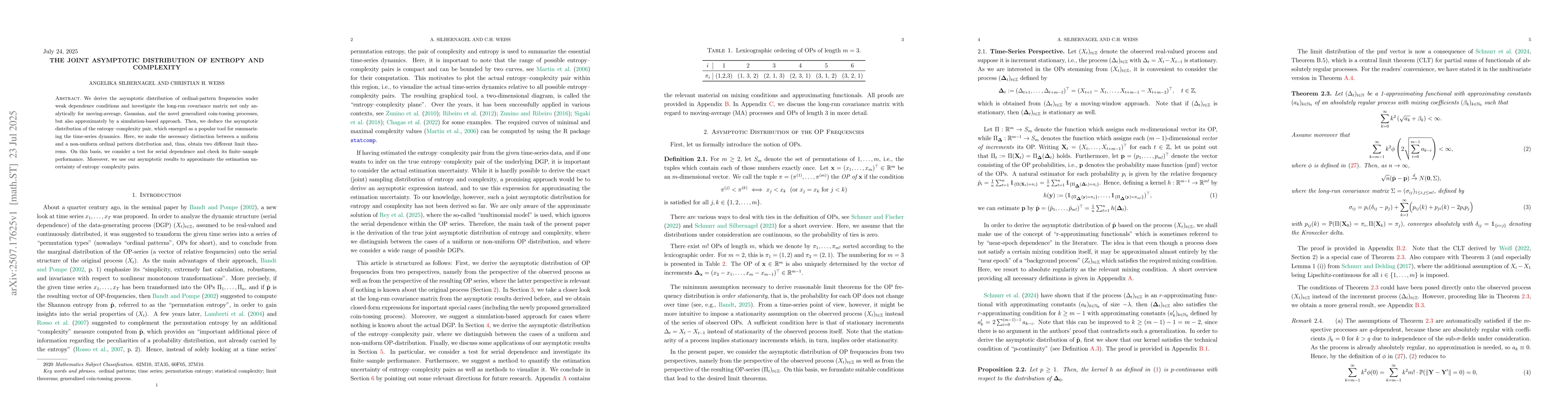 We derive the asymptotic distribution of ordinal-pattern frequencies under weak dependence conditions and investigate the long-run covariance matrix not only analytically for moving-average, Gaussian, and the novel generalized coin-tossing processes, but also approximately by a simulation-based approach. Then, we deduce the asymptotic distribution of the entropy-complexity pair, which emerged as a popular tool for summarizing the time-series dynamics. Here, we make the necessary distinction between a uniform and a non-uniform ordinal pattern distribution and, thus, obtain two different limit theorems. On this basis, we consider a test for serial dependence and check its finite-sample performance. Moreover, we use our asymptotic results to approximate the estimation uncertainty of entropy-complexity pairs.