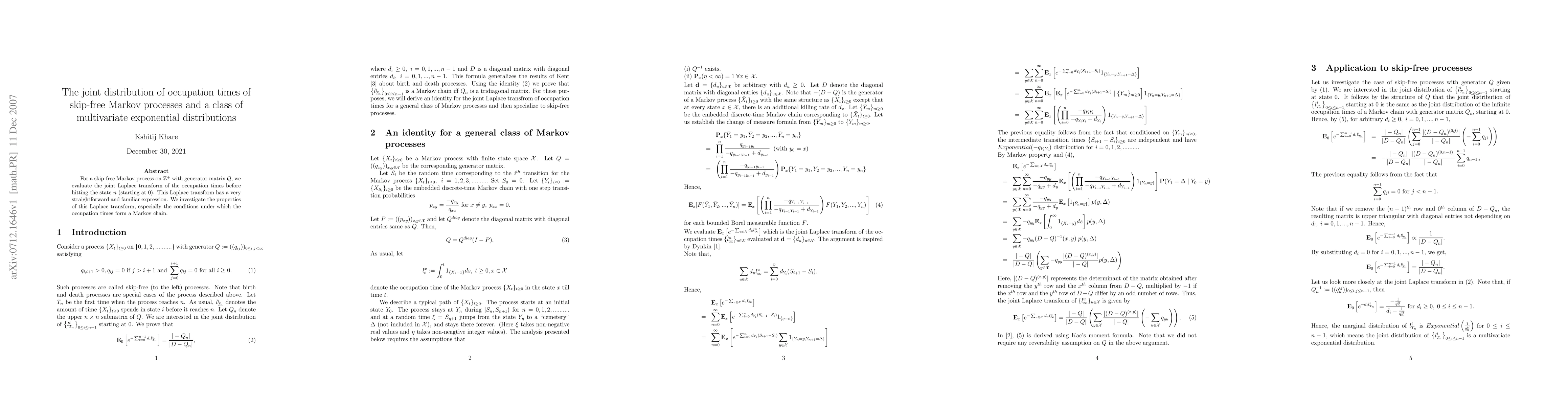 For a skip-free Markov process on non-negative integers with generator matrix Q, we evaluate the joint Laplace transform of the occupation times before hitting the state n (starting at 0). This Laplace transform has a very straightforward and familiar expression. We investigate the properties of this Laplace transform, especially the conditions under which the occupation times form a Markov chain.