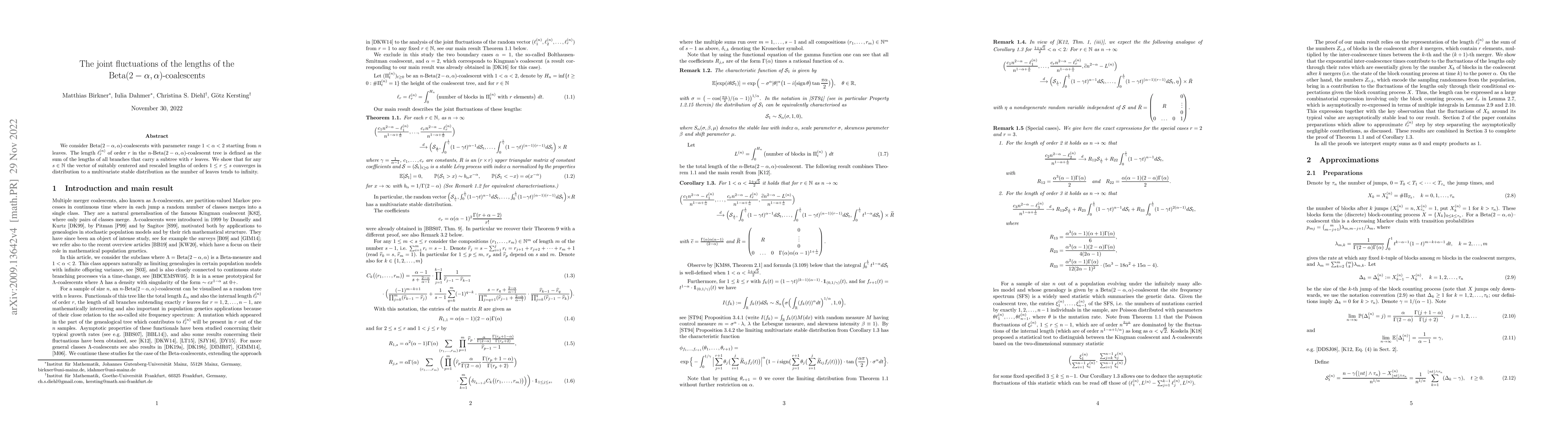 This paper investigates the joint fluctuations of lengths in Beta$(2-\alpha, \alpha)$-coalescents for $1 < \alpha < 2$, showing that the vector of centered and rescaled lengths of orders up to $s$ converges to a multivariate stable distribution as the number of leaves grows infinitely.