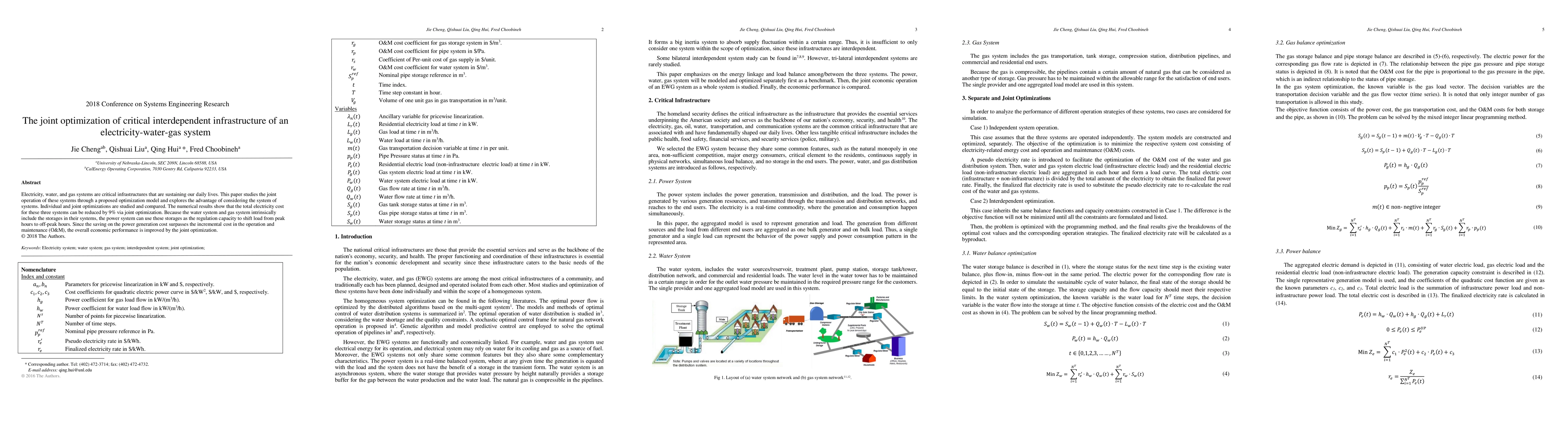 This paper proposes an optimization model for the joint operation of electricity, water, and gas systems, demonstrating a 9% reduction in total electricity cost through integrated optimization. The study highlights that leveraging storage in water and gas systems to regulate electricity demand enhances economic performance despite increased operational costs.