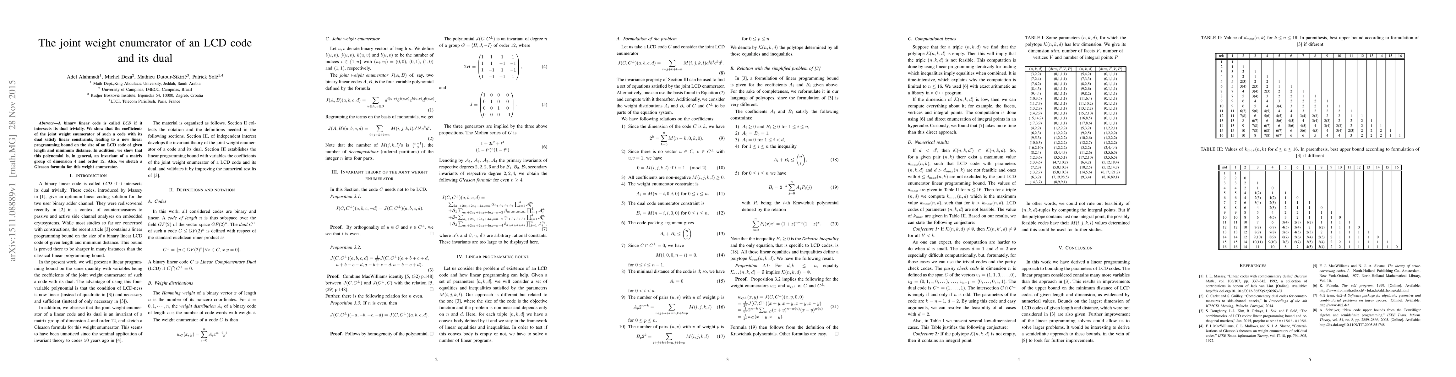 This paper explores the joint weight enumerator of LCD (Linear Code with Dual) codes and their duals, demonstrating linear constraints on its coefficients that yield a new linear programming bound on LCD code sizes. It also reveals that this polynomial is generally invariant under a matrix group of dimension 4 and order 12, and outlines a Gleason formula for the weight enumerator.