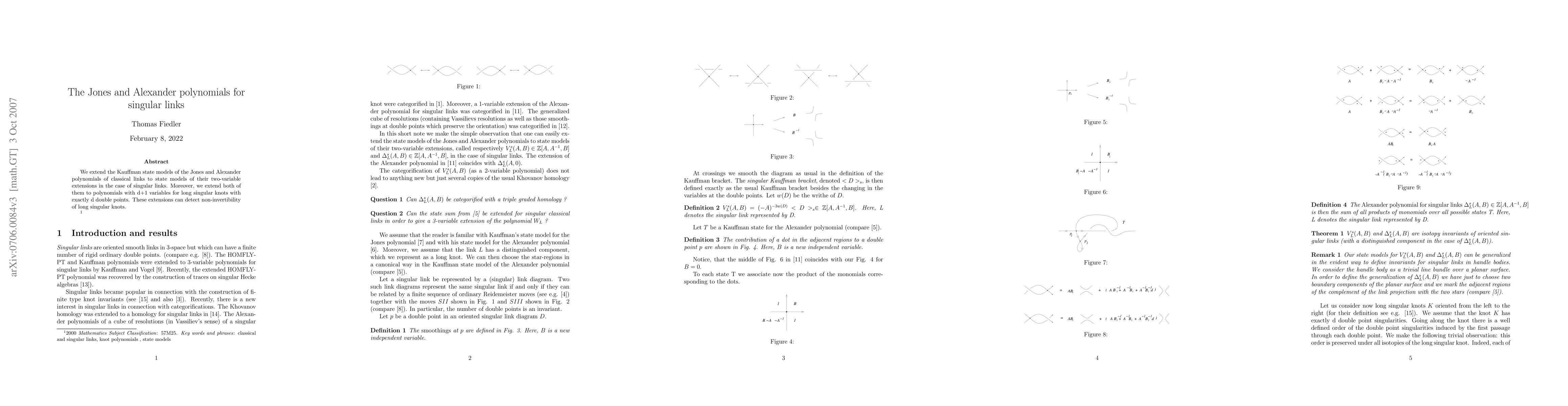 The paper develops state models for Jones and Alexander polynomials applicable to singular links, extending them to polynomials with d+1 variables for long singular knots with exactly d double points, which can detect non-invertibility.
