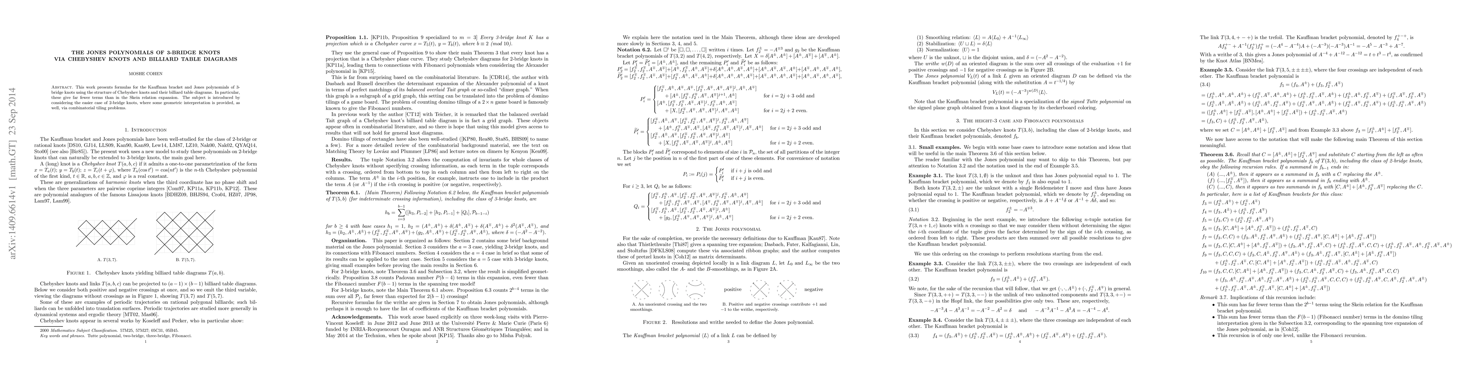 This paper provides a method to compute the Kauffman bracket and Jones polynomials for 3-bridge knots using Chebyshev knots and billiard table diagrams, resulting in fewer terms compared to traditional skein relation expansions. It starts with a simpler analysis of 2-bridge knots, offering geometric interpretations through combinatorial tiling problems.