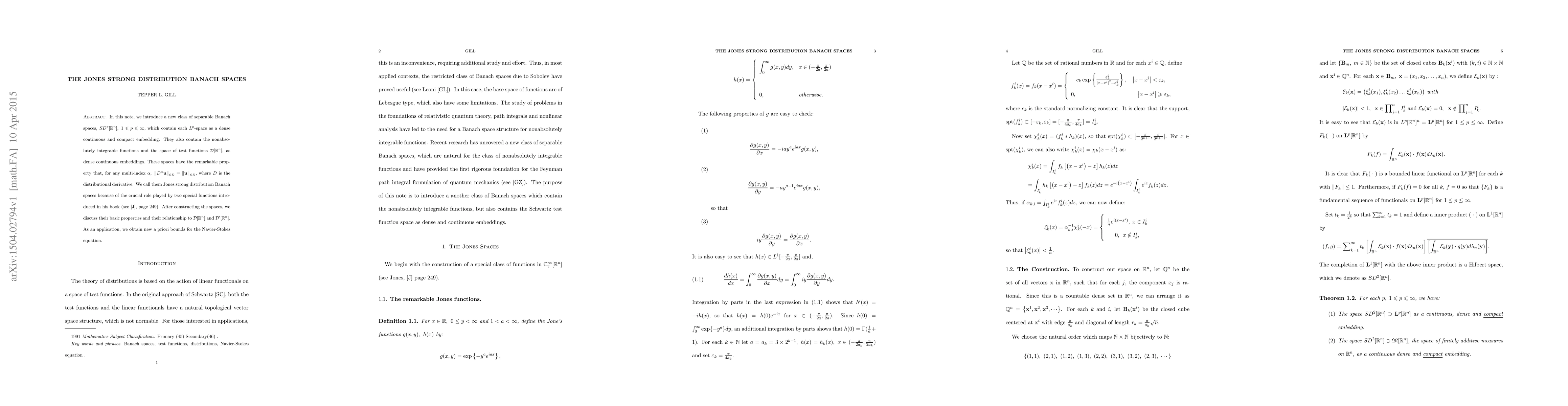 In this note, we introduce a new class of separable Banach spaces, ${SD^p}[{\mathbb{R}^n}],\;1 \leqslant p \leqslant \infty$, which contain each $L^p$-space as a dense continuous and compact embedding. They also contain the nonabsolutely integrable functions and the space of test functions ${\mathcal{D}}[{\mathbb{R}^n}]$, as dense continuous embeddings. These spaces have the remarkable property that, for any multi-index $\alpha, \; \left\| {{D^\alpha }{\mathbf{u}}} \right\|_{SD} = \left\| {\mathbf{u}} \right\|_{SD}$, where $D$ is the distributional derivative. We call them Jones strong distribution Banach spaces because of the crucial role played by two special functions introduced in his book (see \cite{J}, page 249). After constructing the spaces, we discuss their basic properties and their relationship to ${\mathcal{D}}[{\mathbb{R}^n}]$ and ${\mathcal{D'}}[{\mathbb{R}^n}]$. As an application, we obtain new a priori bounds for the Navier-Stokes equation.