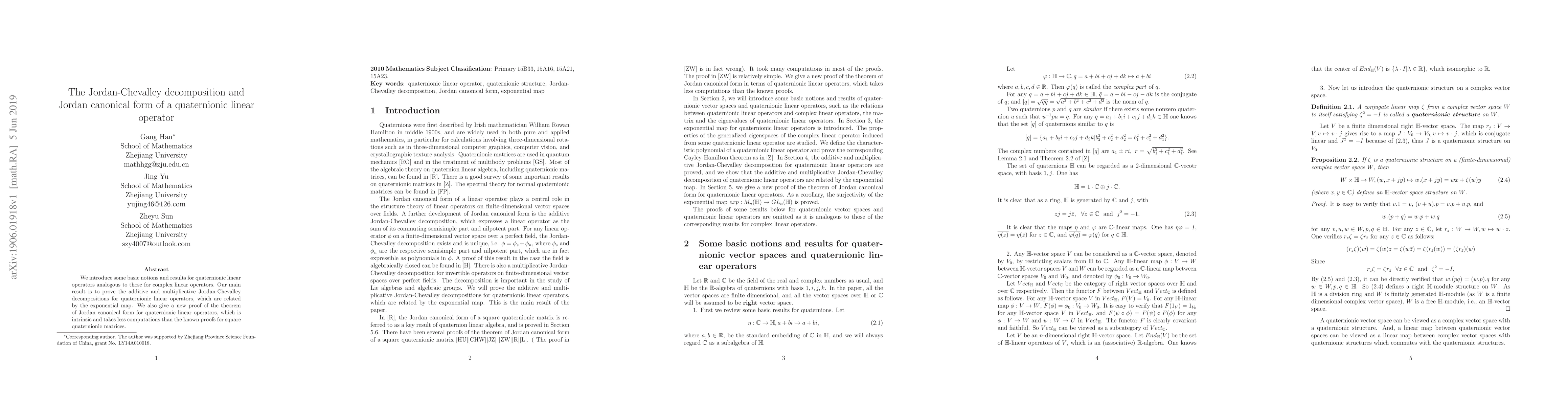Summary: This paper establishes the Jordan-Chevalley decompositions for quaternionic linear operators, analogous to those for complex operators, and provides a new, computationally efficient proof of the Jordan canonical form theorem for quaternionic linear operators.