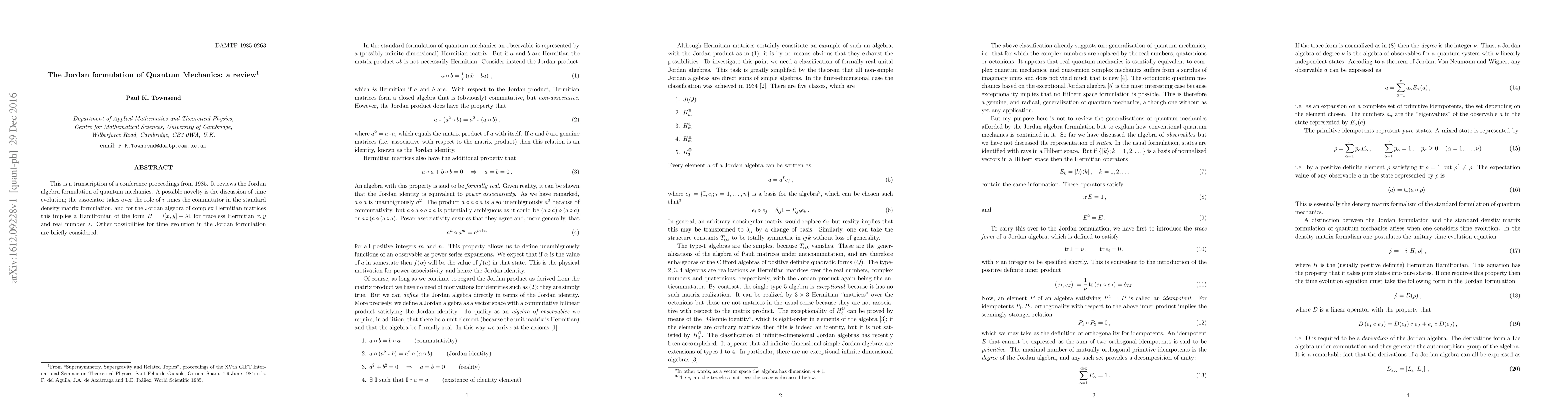 This is a transcription of a conference proceedings from 1985. It reviews the Jordan algebra formulation of quantum mechanics. A possible novelty is the discussion of time evolution; the associator takes over the role of $i$ times the commutator in the standard density matrix formulation, and for the Jordan algebra of complex Hermitian matrices this implies a Hamiltonian of the form $H= i[x,y] + \lambda \mathbb{I}$ for traceless Hermitian $x,y$ and real number $\lambda$. Other possibilities for time evolution in the Jordan formulation are briefly considered.