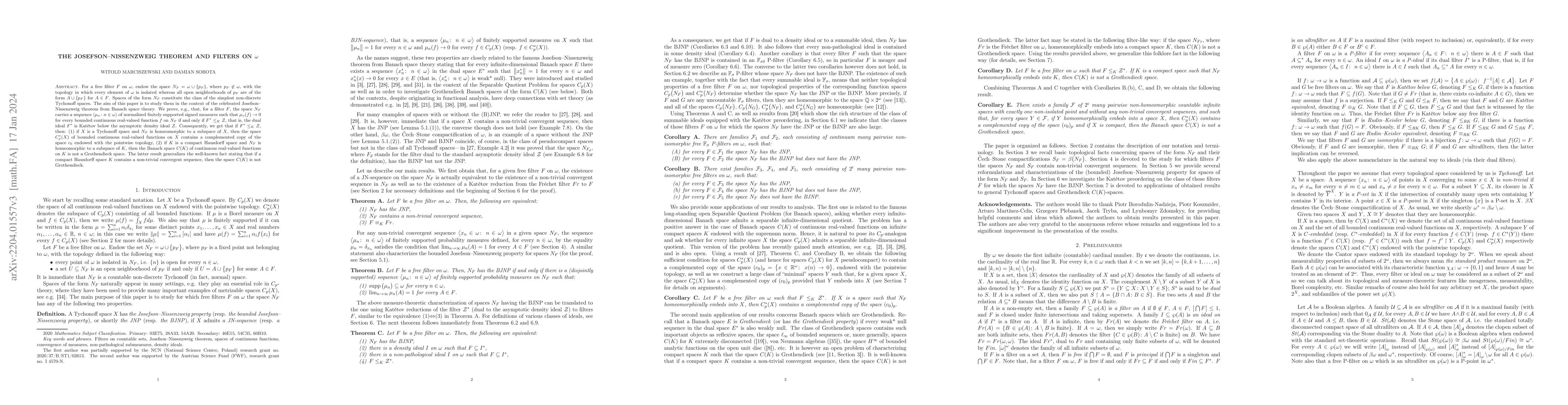 For a free filter $F$ on $\omega$, endow the space $N_F=\omega\cup\{p_F\}$, where $p_F\not\in\omega$, with the topology in which every element of $\omega$ is isolated whereas all open neighborhoods of $p_F$ are of the form $A\cup\{p_F\}$ for $A\in F$. Spaces of the form $N_F$ constitute the class of the simplest non-discrete Tychonoff spaces. The aim of this paper is to study them in the context of the celebrated Josefson--Nissenzweig theorem from Banach space theory. We prove, e.g., that, for a filter $F$, the space $N_F$ carries a sequence $\langle\mu_n\colon n\in\omega\rangle$ of normalized finitely supported signed measures such that $\mu_n(f)\to 0$ for every bounded continuous real-valued function $f$ on $N_F$ if and only if $F^*\le_K\mathcal{Z}$, that is, the dual ideal $F^*$ is Kat\v{e}tov below the asymptotic density ideal $\mathcal{Z}$. Consequently, we get that if $F^*\le_K\mathcal{Z}$, then: (1) if $X$ is a Tychonoff space and $N_F$ is homeomorphic to a subspace of $X$, then the space $C_p^*(X)$ of bounded continuous real-valued functions on $X$ contains a complemented copy of the space $c_0$ endowed with the pointwise topology, (2) if $K$ is a compact Hausdorff space and $N_F$ is homeomorphic to a subspace of $K$, then the Banach space $C(K)$ of continuous real-valued functions on $K$ is not a Grothendieck space. The latter result generalizes the well-known fact stating that if a compact Hausdorff space $K$ contains a non-trivial convergent sequence, then the space $C(K)$ is not Grothendieck.