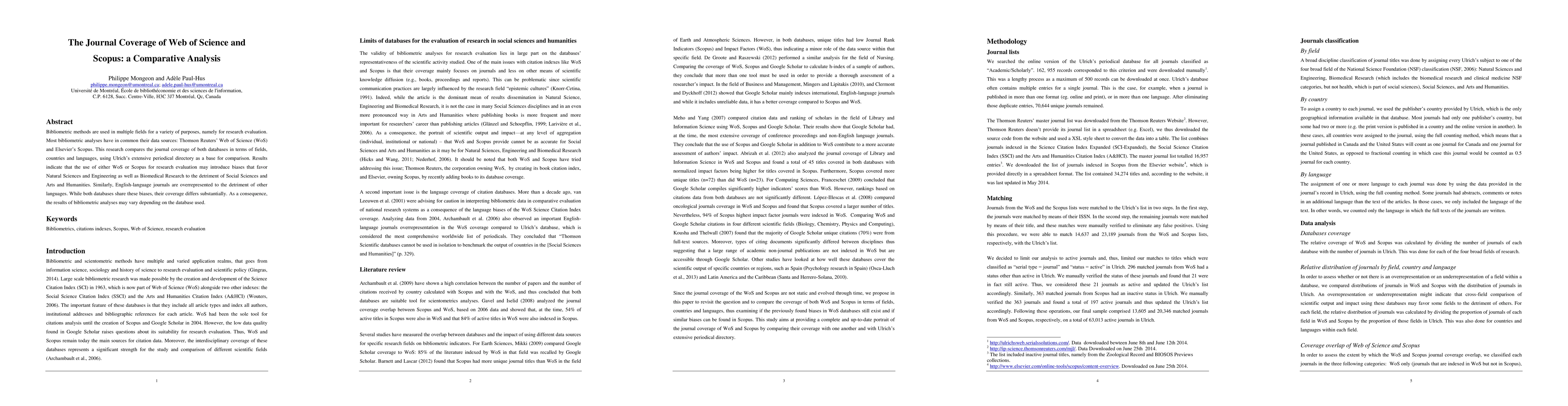 This study compares the journal coverage of Web of Science and Scopus, finding that both databases favor Natural Sciences, Engineering, and Biomedical Research, while underrepresenting Social Sciences and Arts and Humanities. English-language journals are also overrepresented, leading to potential biases in research evaluation. The choice of database significantly impacts bibliometric analysis results.