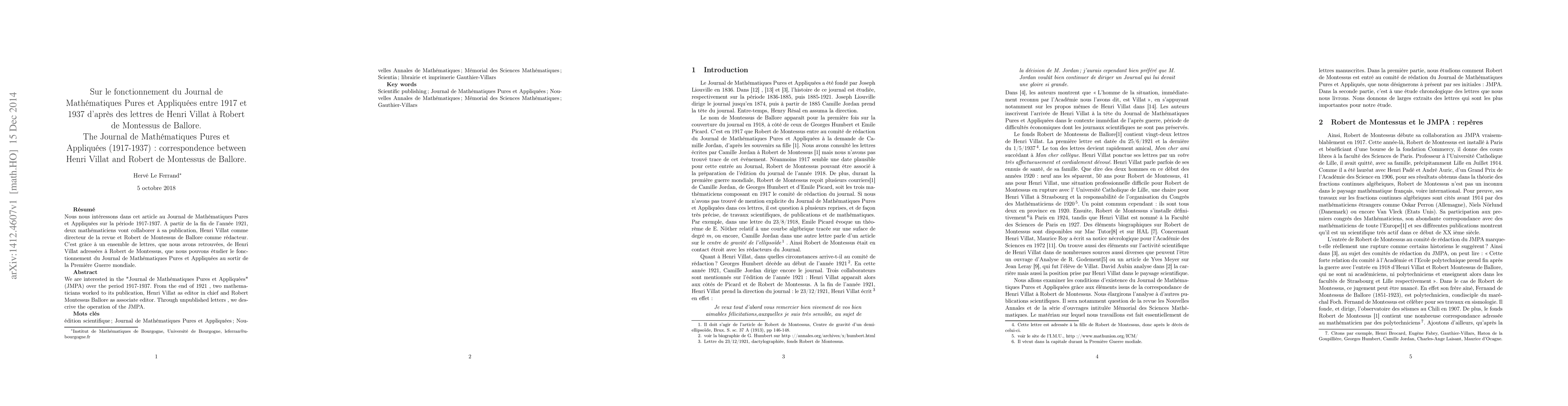 We are interested in the "Journal de Math\'ematiques Pures et Appliqu\'ees" (JMPA) over the period 1917-1937. From the end of 1921, two mathematicians worked to its publication, Henri Villat as editor in chief and Robert Montessus Ballore as associate editor. Through unpublished letters, we descrive the operation of the JMPA.