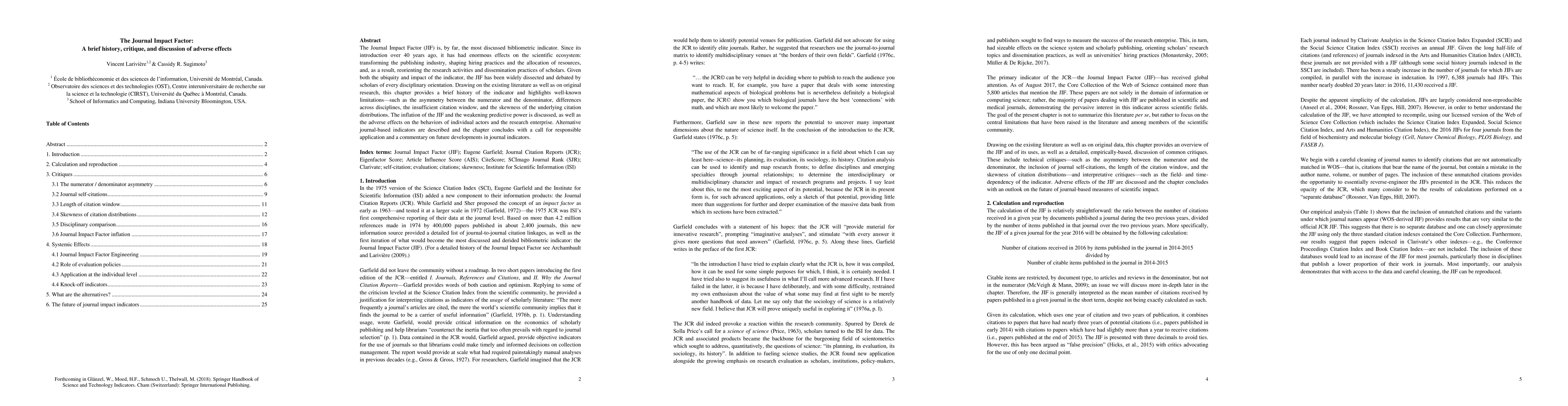 The Journal Impact Factor (JIF) is, by far, the most discussed bibliometric indicator. Since its introduction over 40 years ago, it has had enormous effects on the scientific ecosystem: transforming the publishing industry, shaping hiring practices and the allocation of resources, and, as a result, reorienting the research activities and dissemination practices of scholars. Given both the ubiquity and impact of the indicator, the JIF has been widely dissected and debated by scholars of every disciplinary orientation. Drawing on the existing literature as well as on original research, this chapter provides a brief history of the indicator and highlights well-known limitations-such as the asymmetry between the numerator and the denominator, differences across disciplines, the insufficient citation window, and the skewness of the underlying citation distributions. The inflation of the JIF and the weakening predictive power is discussed, as well as the adverse effects on the behaviors of individual actors and the research enterprise. Alternative journal-based indicators are described and the chapter concludes with a call for responsible application and a commentary on future developments in journal indicators.