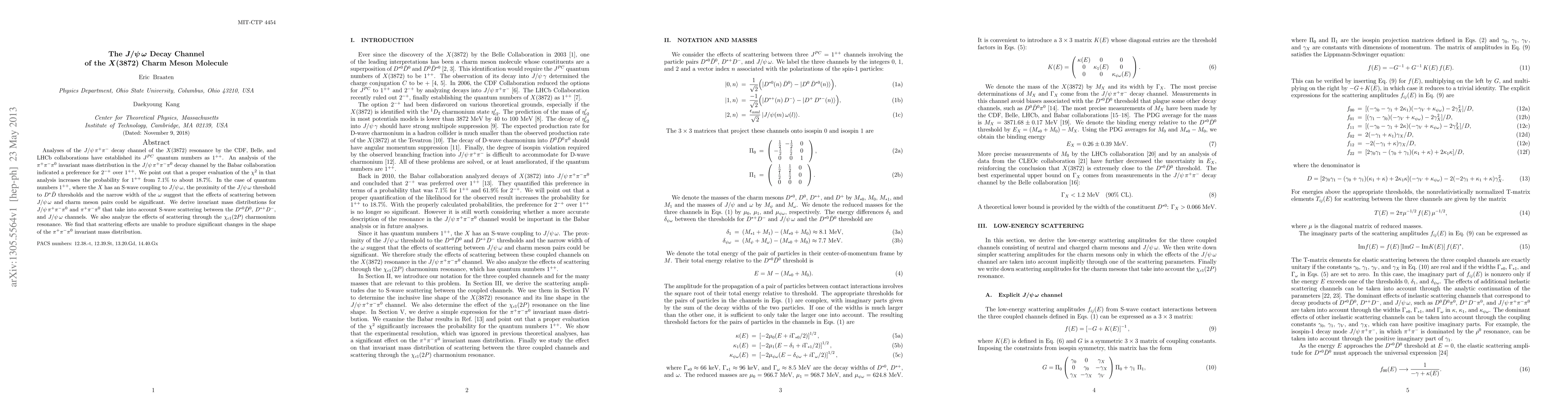 Analyses of the J/{\psi} {\pi}+ {\pi}- decay channel of the X(3872) resonance by the CDF, Belle, and LHCb collaborations have established its J^{PC} quantum numbers as 1^{++}. An analysis of the \pi+ \pi- \pi 0 invariant mass distribution in the J/{\psi} \pi+ \pi- \pi 0 decay channel by the Babar collaboration indicated a preference for 2^{-+} over 1^{++}. We point out that a proper evaluation of the chi^2 in that analysis increases the probability for 1^{++} from 7.1% to about 18.7%. In the case of quantum numbers 1^{++}, where the X has an S-wave coupling to J/{\psi} {\omega}, the proximity of the J/{\psi} {\omega} threshold to D^* Dbar thresholds and the narrow width of the {\omega} suggest that the effects of scattering between J/{\psi} {\omega} and charm meson pairs could be significant. We derive invariant mass distributions for J/{\psi} \pi+ \pi- and \pi+ \pi- \pi 0 that take into account S-wave scattering between the D^{*0} Dbar^0, D^{*+} D^-, and J/{\psi} {\omega} channels. We also analyze the effects of scattering through the chi_{c1}(2P) charmonium resonance. We find that scattering effects are unable to produce significant changes in the shape of the \pi+ \pi- {\pi} 0 invariant mass distribution.