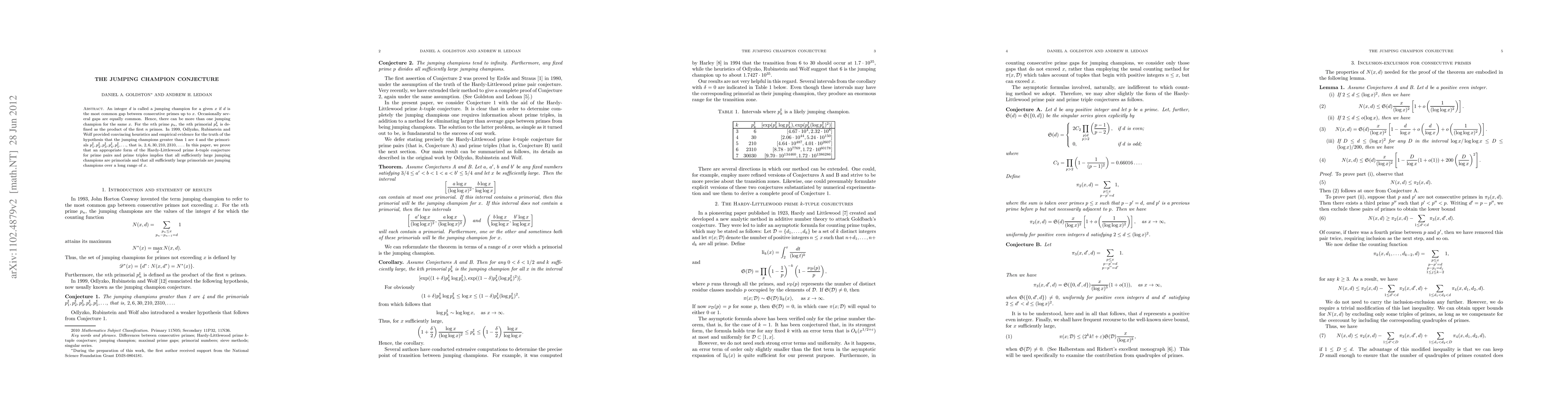 An integer $d$ is called a jumping champion for a given $x$ if $d$ is the most common gap between consecutive primes up to $x$. Occasionally several gaps are equally common. Hence, there can be more than one jumping champion for the same $x$. For the $n$th prime $p_{n}$, the $n$th primorial $p_{n}^{\sharp}$ is defined as the product of the first $n$ primes. In 1999, Odlyzko, Rubinstein and Wolf provided convincing heuristics and empirical evidence for the truth of the hypothesis that the jumping champions greater than 1 are 4 and the primorials $p_{1}^{\sharp}, p_{2}^{\sharp}, p_{3}^{\sharp}, p_{4}^{\sharp}, p_{5}^{\sharp}, ...$, that is, $2, 6, 30, 210, 2310, ....$ In this paper, we prove that an appropriate form of the Hardy-Littlewood prime $k$-tuple conjecture for prime pairs and prime triples implies that all sufficiently large jumping champions are primorials and that all sufficiently large primorials are jumping champions over a long range of $x$.