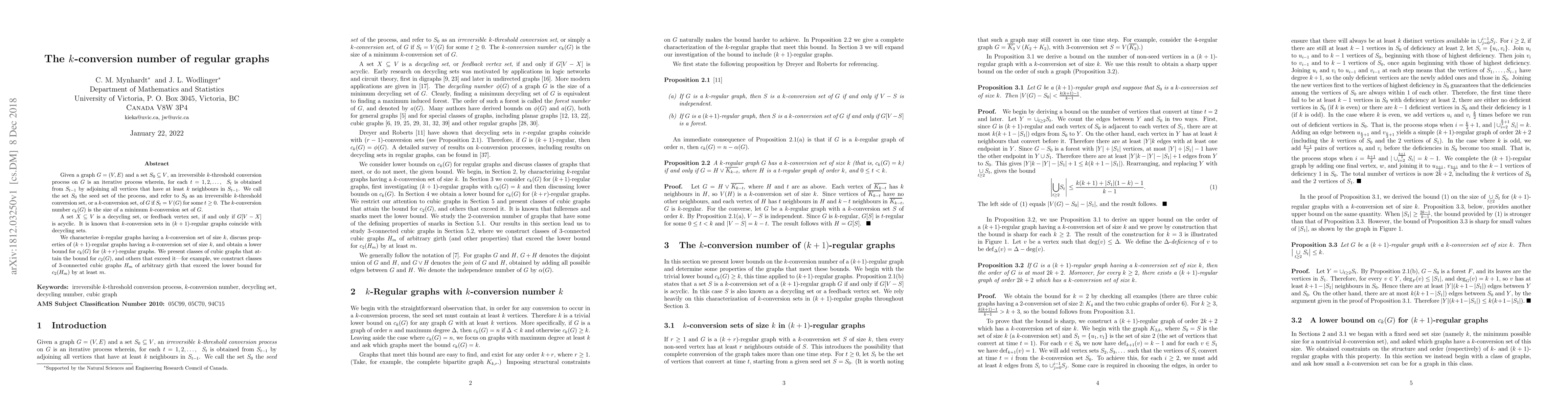 Given a graph $G=(V,E)$ and a set $S_0\subseteq V$, an irreversible $k$-threshold conversion process on $G$ is an iterative process wherein, for each $t=1,2,\dots$, $S_t$ is obtained from $S_{t-1}$ by adjoining all vertices that have at least $k$ neighbours in $S_{t-1}$. We call the set $S_0$ the seed set of the process, and refer to $S_0$ as an irreversible $k$-threshold conversion set, or a $k$-conversion set, of $G$ if $S_t=V(G)$ for some $t\geq 0$. The $k$-conversion number $c_{k}(G)$ is the size of a minimum $k$-conversion set of $G$. A set $X\subseteq V$ is a decycling set, or feedback vertex set, if and only if $G[V-X]$ is acyclic. It is known that $k$-conversion sets in $(k+1)$-regular graphs coincide with decycling sets. We characterize $k$-regular graphs having a $k$-conversion set of size $k$, discuss properties of $(k+1)$-regular graphs having a $k$-conversion set of size $k$, and obtain a lower bound for $c_k(G)$ for $(k+r)$-regular graphs. We present classes of cubic graphs that attain the bound for $c_2(G)$, and others that exceed it---for example, we construct classes of $3$-connected cubic graphs $H_m$ of arbitrary girth that exceed the lower bound for $c_2(H_m)$ by at least $m$.