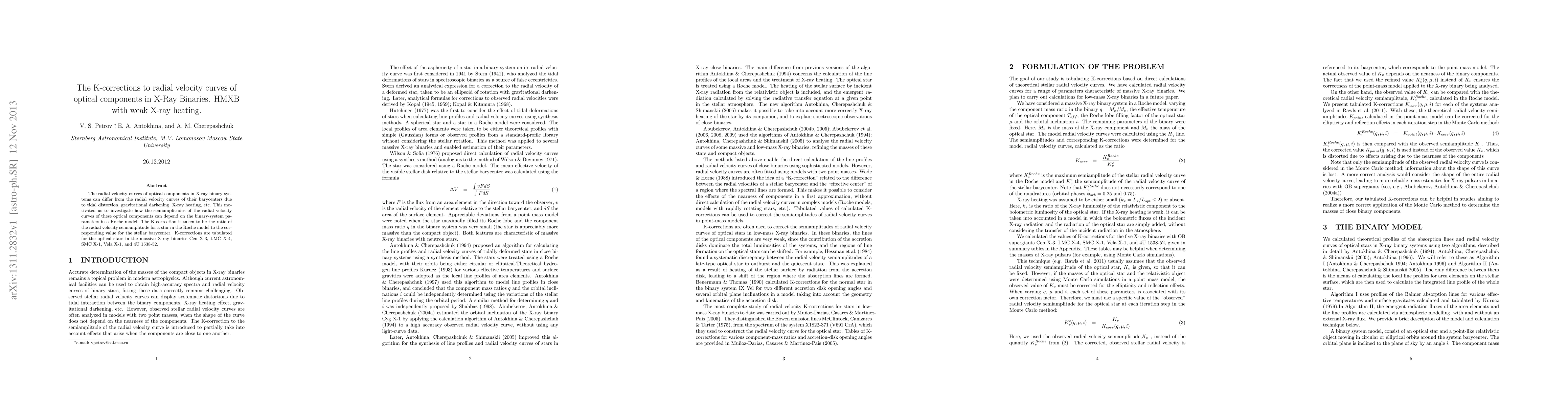 This research calculates K-corrections for optical stars in massive X-ray binaries, determining how their radial velocity curves deviate from barycentric values due to factors like tidal distortion and X-ray heating. Results are tabulated for Cen X-3, LMC X-4, SMC X-1, Vela X-1, and 4U 1538-52.