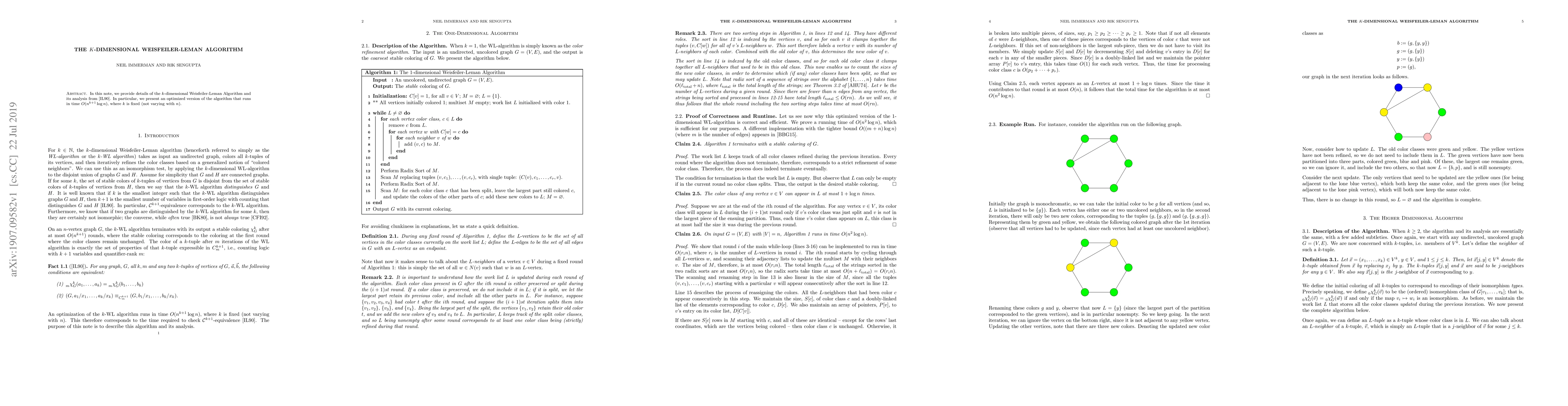 Summary: This paper presents an optimized version of the $k$-dimensional Weisfeiler-Leman Algorithm, which operates in $O(n^{k+1}\log n)$ time, improving upon the original analysis by Immerman and Lander from 1990. The focus is on a fixed $k$ value, not dependent on the size of the input $n$.