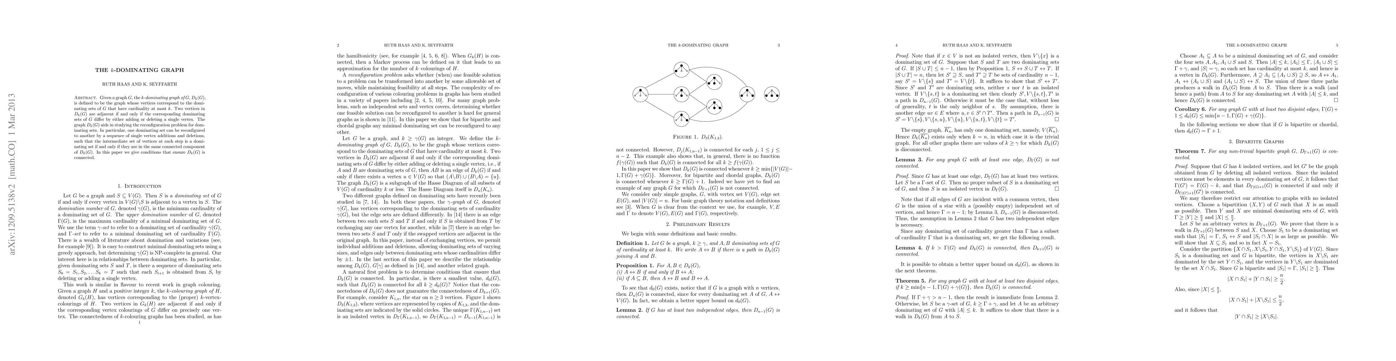 Summary: This paper defines the $k$-dominating graph $D_k(G)$ based on dominating sets of a given graph $G$ and explores conditions ensuring its connectivity, which is vital for studying the reconfiguration of dominating sets.