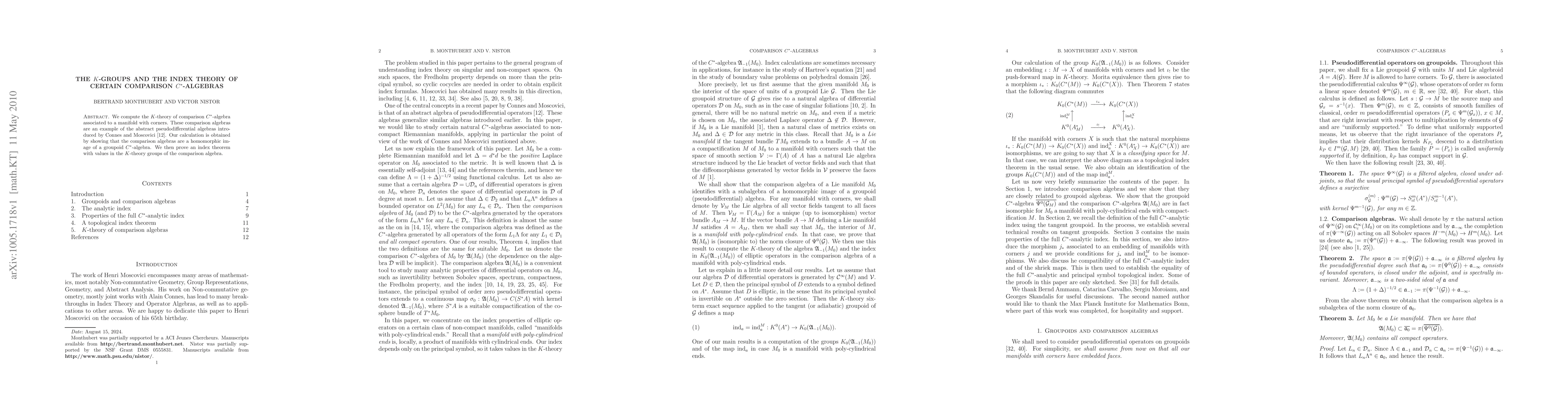 This paper computes the $K$-theory of comparison $C^*$-algebras associated with manifolds with corners, demonstrating they are homomorphic images of groupoid $C^*$-algebras, and proves an index theorem linking these algebras to their $K$-theory groups.