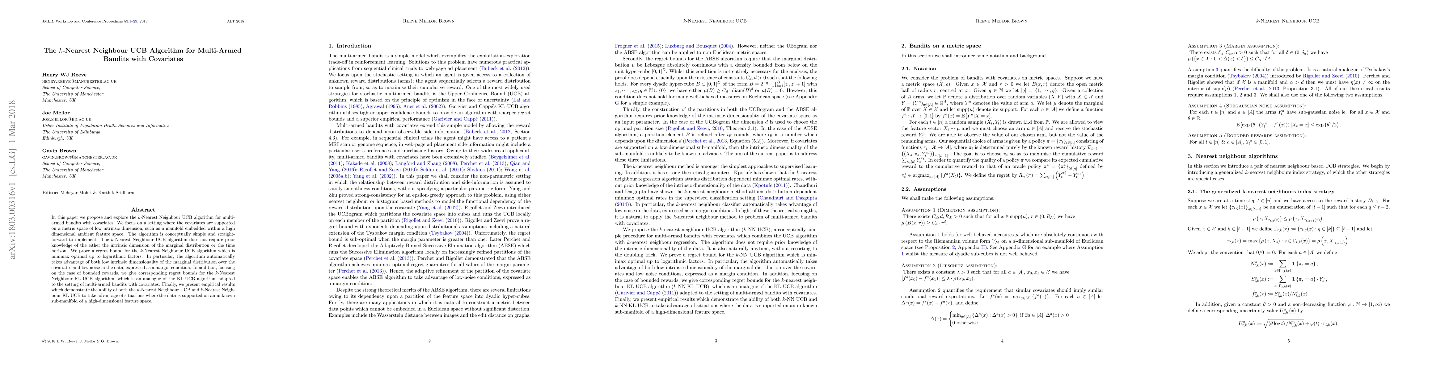 In this paper we propose and explore the k-Nearest Neighbour UCB algorithm for multi-armed bandits with covariates. We focus on a setting where the covariates are supported on a metric space of low intrinsic dimension, such as a manifold embedded within a high dimensional ambient feature space. The algorithm is conceptually simple and straightforward to implement. The k-Nearest Neighbour UCB algorithm does not require prior knowledge of the either the intrinsic dimension of the marginal distribution or the time horizon. We prove a regret bound for the k-Nearest Neighbour UCB algorithm which is minimax optimal up to logarithmic factors. In particular, the algorithm automatically takes advantage of both low intrinsic dimensionality of the marginal distribution over the covariates and low noise in the data, expressed as a margin condition. In addition, focusing on the case of bounded rewards, we give corresponding regret bounds for the k-Nearest Neighbour KL-UCB algorithm, which is an analogue of the KL-UCB algorithm adapted to the setting of multi-armed bandits with covariates. Finally, we present empirical results which demonstrate the ability of both the k-Nearest Neighbour UCB and k-Nearest Neighbour KL-UCB to take advantage of situations where the data is supported on an unknown sub-manifold of a high-dimensional feature space.