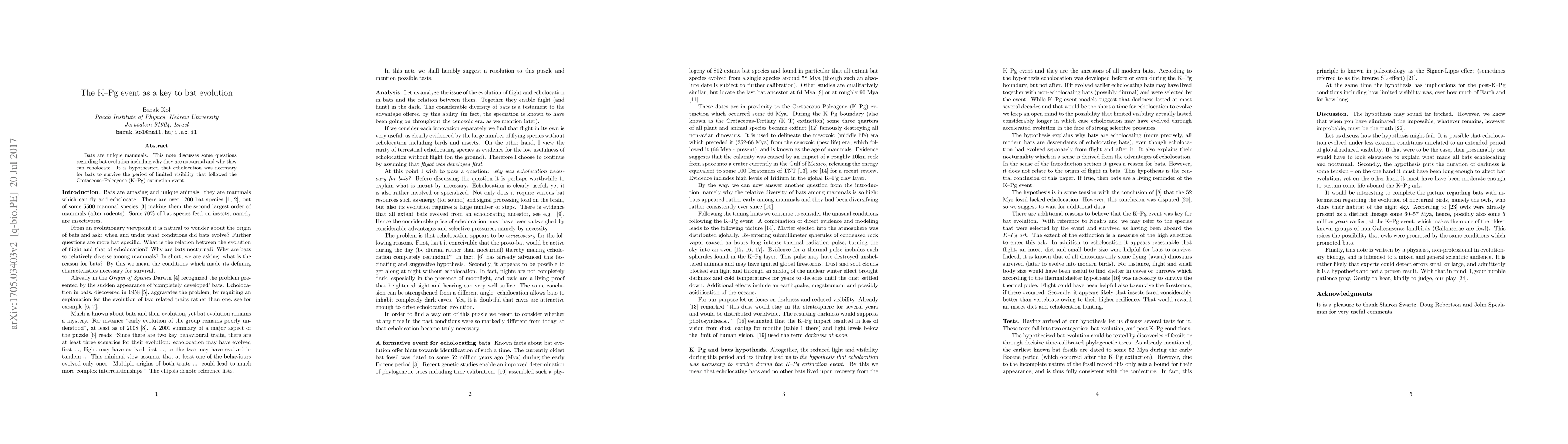 Bats are unique mammals. This note discusses some questions regarding bat evolution including why they are nocturnal and why they can echolocate. It is hypothesized that echolocation was necessary for bats to survive the period of limited visibility that followed the Cretaceous-Paleogene (K-Pg) extinction event.