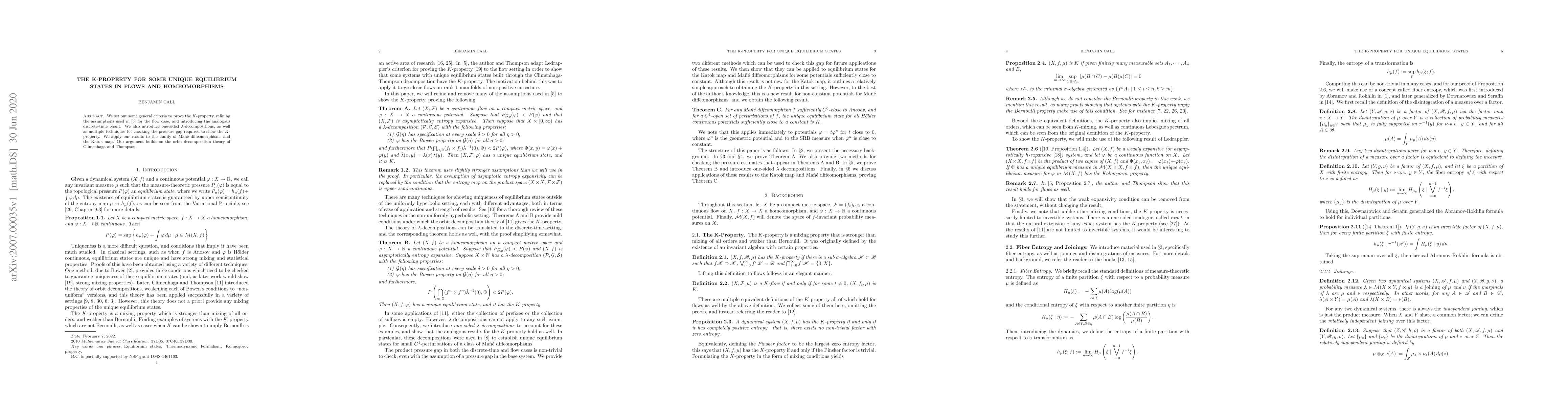 The paper refines criteria for the K-property in certain equilibrium states of flows and homeomorphisms, introducing new techniques to verify a pressure gap required for its proof. The authors apply these results to specific examples, such as Maáné diffeomorphisms and the Katok map.