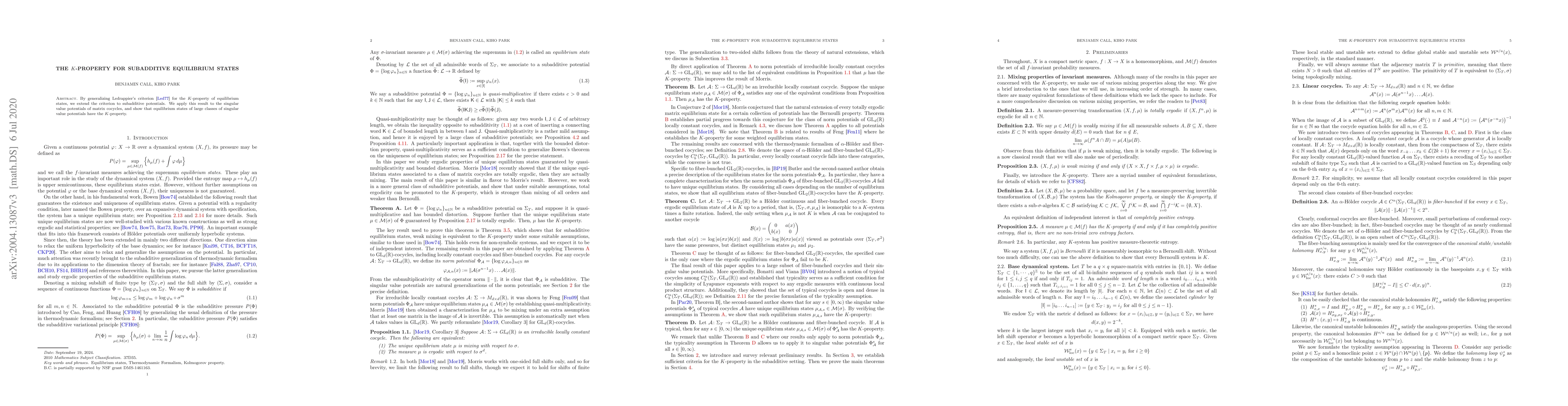This paper generalizes Ledrappier's criterion for equilibrium states to subadditive potentials, demonstrating that many singular value potentials of matrix cocycles possess the $K$-property. This extension provides new insights into the behavior of these equilibrium states.
