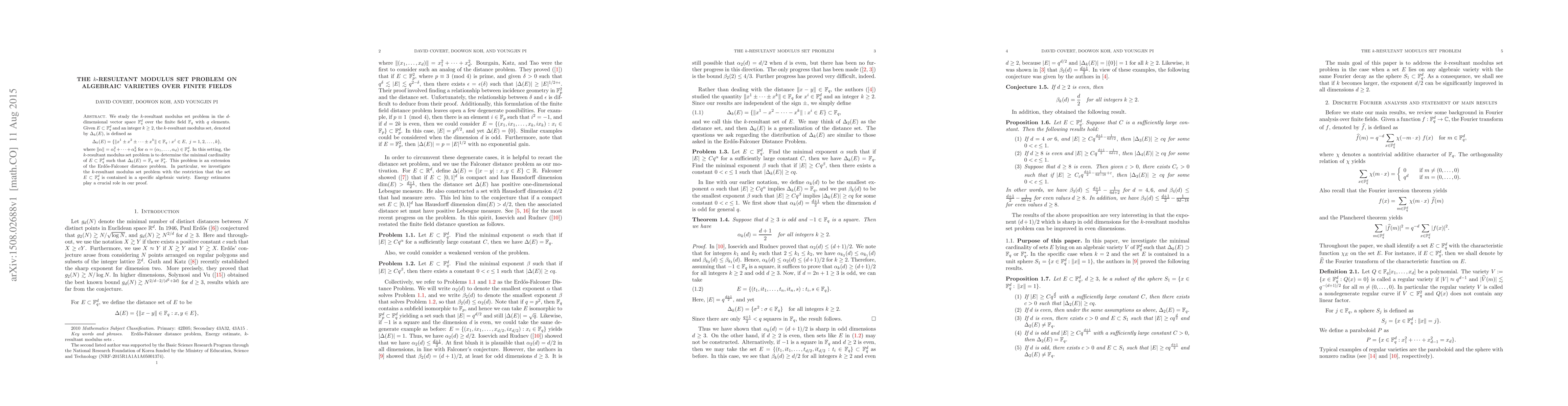We study the $k$-resultant modulus set problem in the $d$-dimensional vector space $\mathbb F_q^d$ over the finite field $\mathbb F_q$ with $q$ elements. Given $E\subset \mathbb F_q^d$ and an integer $k\ge 2$, the $k$-resultant modulus set, denoted by $\Delta_k(E)$, is defined as $$ \Delta_k(E)=\{\|x^1\pm x^2 \pm \cdots \pm x^k\|\in \mathbb F_q: x^j\in E, ~j=1,2,\ldots, k\},$$ where $\|\alpha\|=\alpha_1^2+\cdots+ \alpha_d^2$ for $\alpha=(\alpha_1, \ldots, \alpha_d) \in \mathbb F_q^d.$ In this setting, the $k$-resultant modulus set problem is to determine the minimal cardinality of $E\subset \mathbb F_q^d$ such that $\Delta_k(E) = \mathbb F_q$ or $\mathbb{F}_q^*$. This problem is an extension of the Erd\H{o}s-Falconer distance problem. In particular, we investigate the $k$-resultant modulus set problem with the restriction that the set $E\subset \mathbb F_q^d$ is contained in a specific algebraic variety. Energy estimates play a crucial role in our proof.
