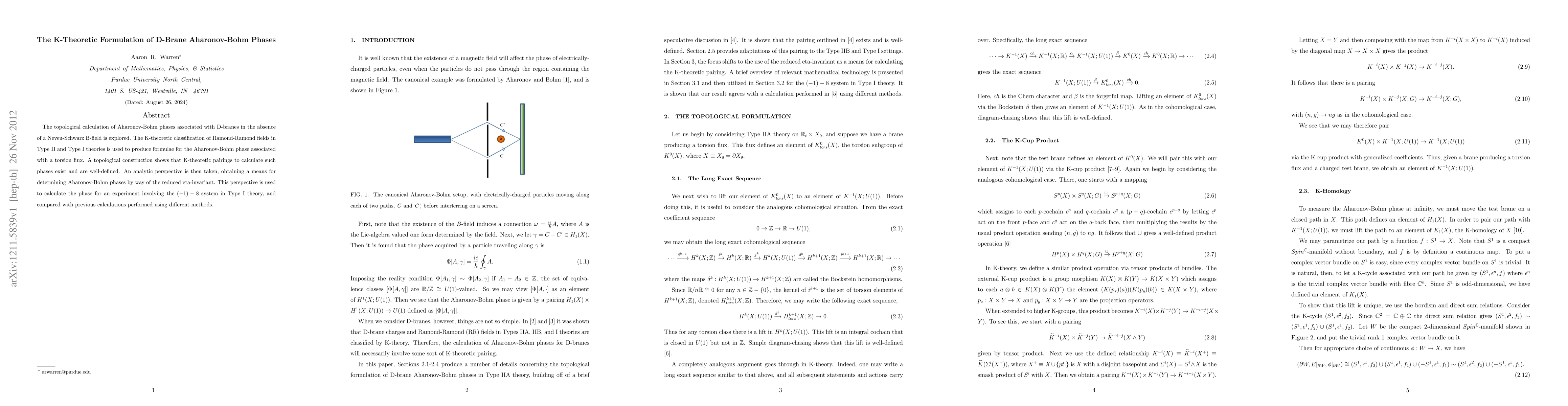 This paper explores the topological calculation of Aharonov-Bohm phases for D-branes without a Neveu-Schwarz B-field, utilizing K-theory to classify Ramond-Ramond fields and derive phase formulas. It concludes with an analytic method using the reduced eta-invariant to determine these phases, exemplified by calculating the phase for the $(-1)-8$ system in Type I theory.