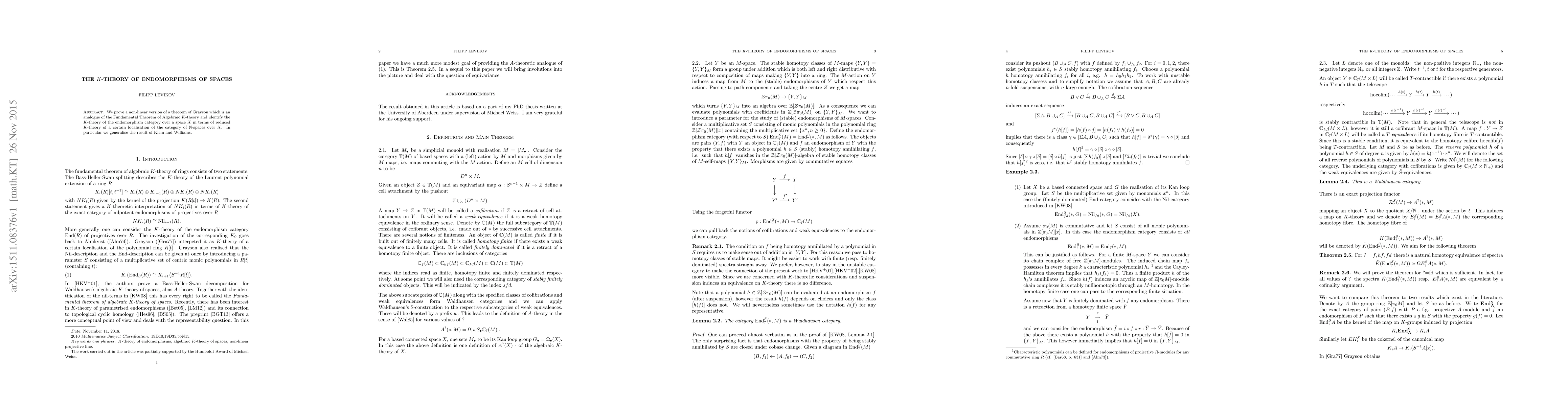 We prove a non-linear version of a theorem of Grayson which is an analogue of the Fundamental Theorem of Algebraic $K$-theory and identify the $K$-theory of the endomorphism category over a space $X$ in terms of reduced $K$-theory of a certain localisation of the category of $\NN$-spaces over $X$. In particular we generalise the result of Klein and Williams describing the nil-terms of $A$-theory in terms of $K$-theory of nilpotent endomorphisms.