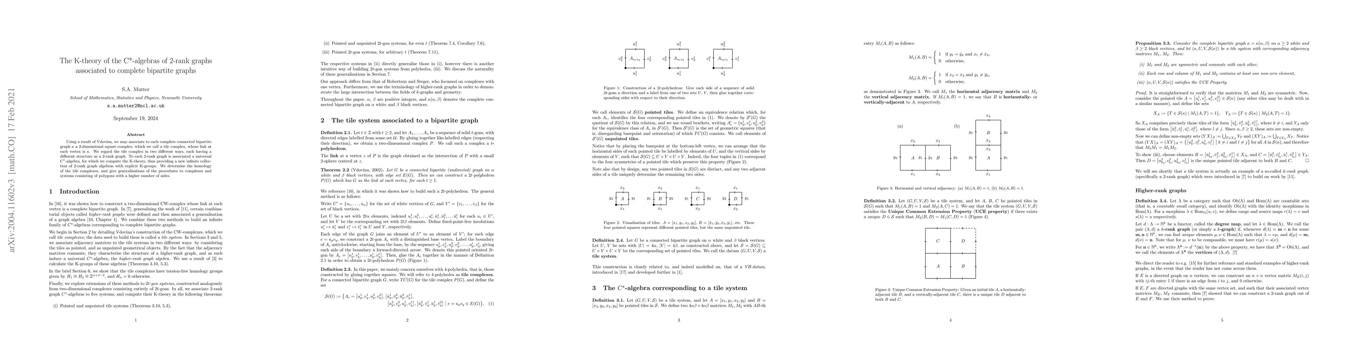 Using a result of Vdovina, we may associate to each complete connected bipartite graph $\kappa$ a $2$-dimensional square complex, which we call a tile complex, whose link at each vertex is $\kappa$. We regard the tile complex in two different ways, each having a different structure as a $2$-rank graph. To each $2$-rank graph is associated a universal C*-algebra, for which we compute the K-theory, thus providing a new infinite collection of $2$-rank graph algebras with explicit K-groups. We determine the homology of the tile complexes, and give generalisations of the procedures to complexes and systems consisting of polygons with a higher number of sides.