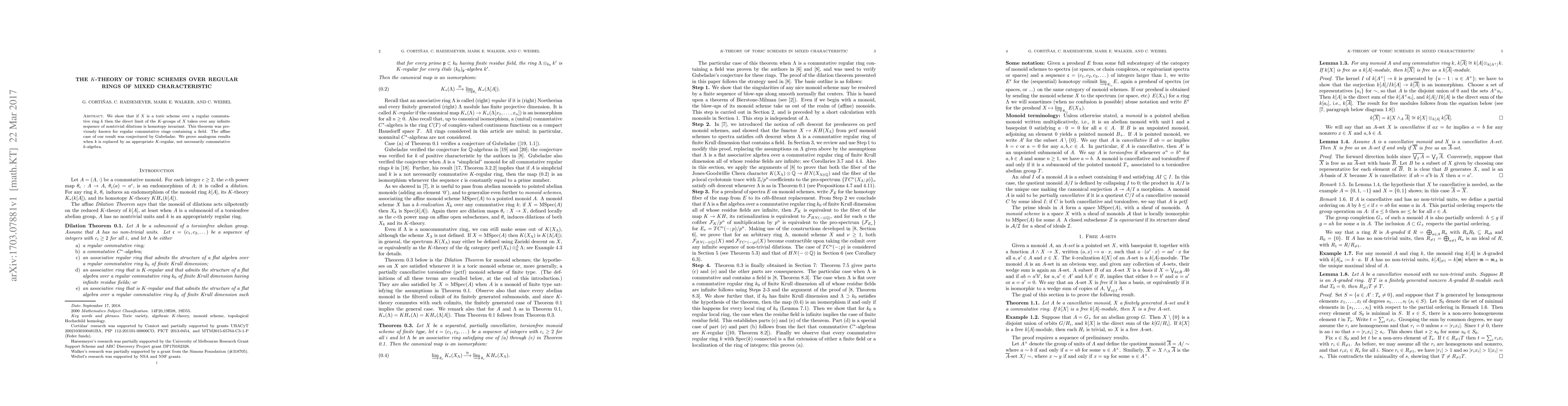 We show that if $X$ is a toric scheme over a regular commutative ring $k$ then the direct limit of the $K$-groups of $X$ taken over any infinite sequence of nontrivial dilations is homotopy invariant. This theorem was previously known for regular commutative rings containing a field. The affine case of our result was conjectured by Gubeladze. We prove analogous results when $k$ is replaced by an appropriate $K$-regular, not necessarily commutative $k$-algebra.