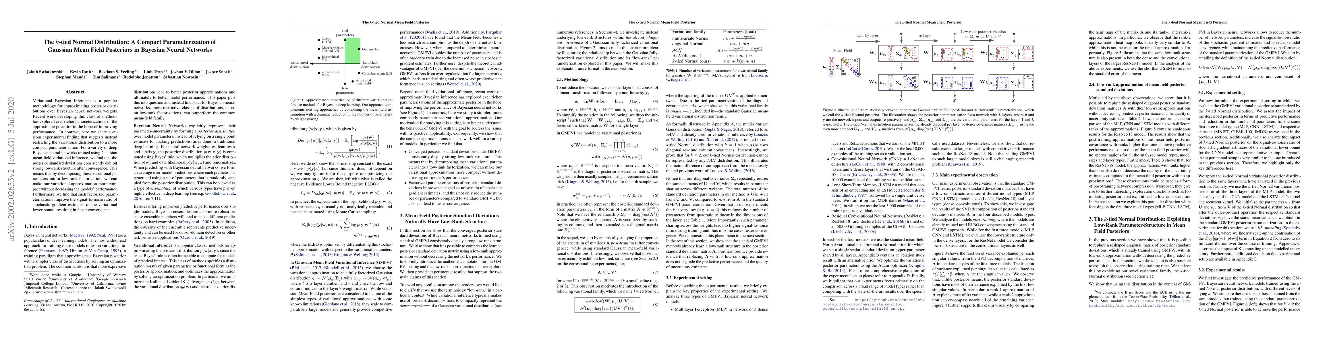 Variational Bayesian Inference is a popular methodology for approximating posterior distributions over Bayesian neural network weights. Recent work developing this class of methods has explored ever richer parameterizations of the approximate posterior in the hope of improving performance. In contrast, here we share a curious experimental finding that suggests instead restricting the variational distribution to a more compact parameterization. For a variety of deep Bayesian neural networks trained using Gaussian mean-field variational inference, we find that the posterior standard deviations consistently exhibit strong low-rank structure after convergence. This means that by decomposing these variational parameters into a low-rank factorization, we can make our variational approximation more compact without decreasing the models' performance. Furthermore, we find that such factorized parameterizations improve the signal-to-noise ratio of stochastic gradient estimates of the variational lower bound, resulting in faster convergence.