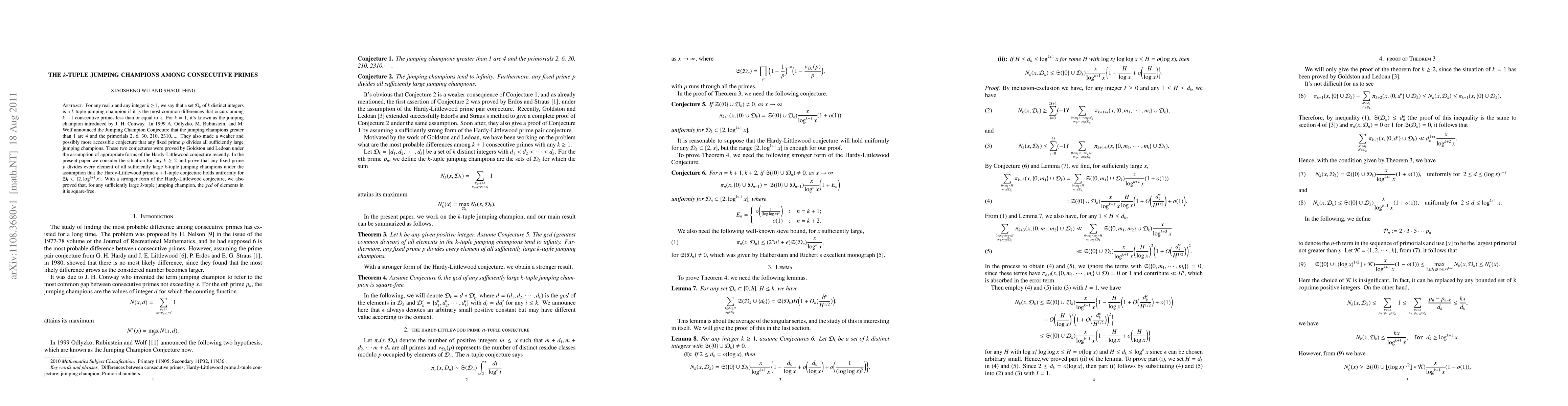 For any real $x$ and any integer $k\ge1$, we say that a set $\mathcal{D}_{k}$ of $k$ distinct integers is a $k$-tuple jumping champion if it is the most common differences that occurs among $k+1$ consecutive primes less than or equal to $x$. For $k=1$, it's known as the jumping champion introduced by J. H. Conway. In 1999 A. Odlyzko, M. Rubinstein, and M. Wolf announced the Jumping Champion Conjecture that the jumping champions greater than 1 are 4 and the primorials 2, 6, 30, 210, 2310,.... They also made a weaker and possibly more accessible conjecture that any fixed prime $p$ divides all sufficiently large jumping champions. These two conjectures were proved by Goldston and Ledoan under the assumption of appropriate forms of the Hardy-Littlewood conjecture recently. In the present paper we consider the situation for any $k\ge2$ and prove that any fixed prime $p$ divides every element of all sufficiently large $k$-tuple jumping champions under the assumption that the Hardy-Littlewood prime $k+1$-tuple conjecture holds uniformly for $\mathcal{D}_k\subset[2,\log^{k+1}x]$. With a stronger form of the Hardy-Littlewood conjecture, we also proved that, for any sufficiently large $k$-tuple jumping champion, the $gcd$ of elements in it is square-free.