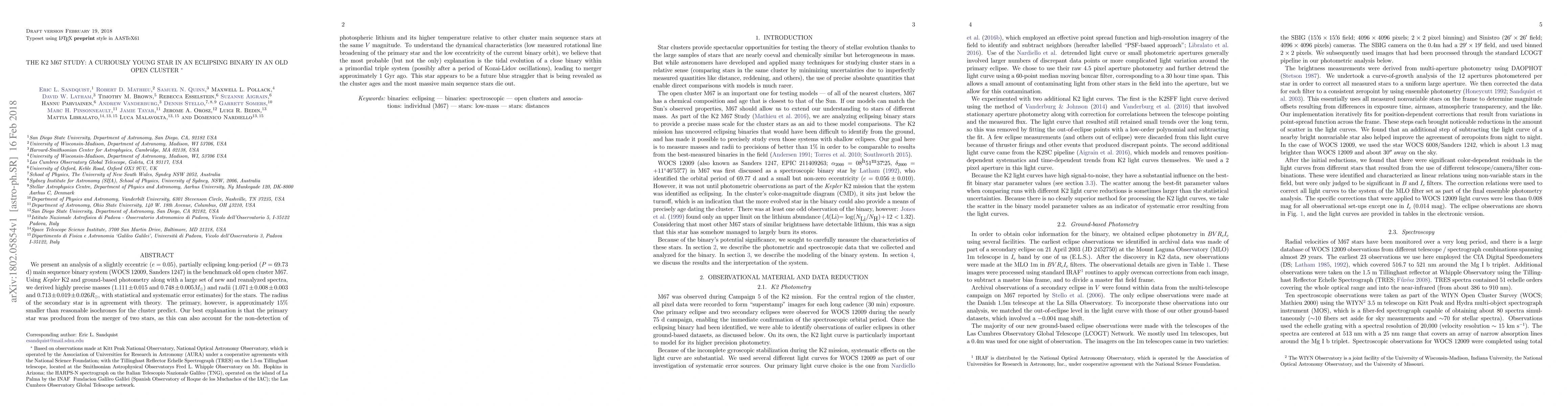 We present an analysis of a slightly eccentric ($e=0.05$), partially eclipsing long-period ($P = 69.73$ d) main sequence binary system (WOCS 12009, Sanders 1247) in the benchmark old open cluster M67. Using Kepler K2 and ground-based photometry along with a large set of new and reanalyzed spectra, we derived highly precise masses ($1.111\pm0.015$ and $0.748\pm0.005 M_\odot$) and radii ($1.071\pm0.008\pm0.003$ and $0.713\pm0.019\pm0.026 R_\odot$, with statistical and systematic error estimates) for the stars. The radius of the secondary star is in agreement with theory. The primary, however, is approximately $15\%$ smaller than reasonable isochrones for the cluster predict. Our best explanation is that the primary star was produced from the merger of two stars, as this can also account for the non-detection of photospheric lithium and its higher temperature relative to other cluster main sequence stars at the same $V$ magnitude. To understand the dynamical characteristics (low measured rotational line broadening of the primary star and the low eccentricity of the current binary orbit), we believe that the most probable (but not the only) explanation is the tidal evolution of a close binary within a primordial triple system (possibly after a period of Kozai-Lidov oscillations), leading to merger approximately 1Gyr ago. This star appears to be a future blue straggler that is being revealed as the cluster ages and the most massive main sequence stars die out.