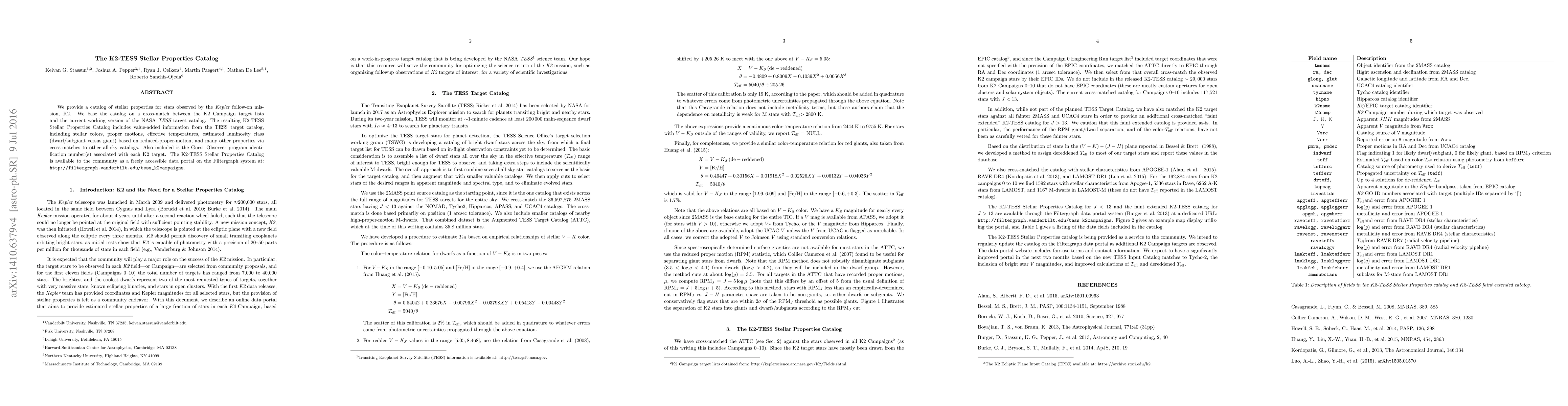 The K2-TESS Stellar Properties Catalog compiles stellar properties for stars observed by the K2 mission, integrating data from the TESS target catalog, including colors, proper motions, and luminosity classes, and is available via the Filtergraph system. This resource is freely accessible for the astronomical community.