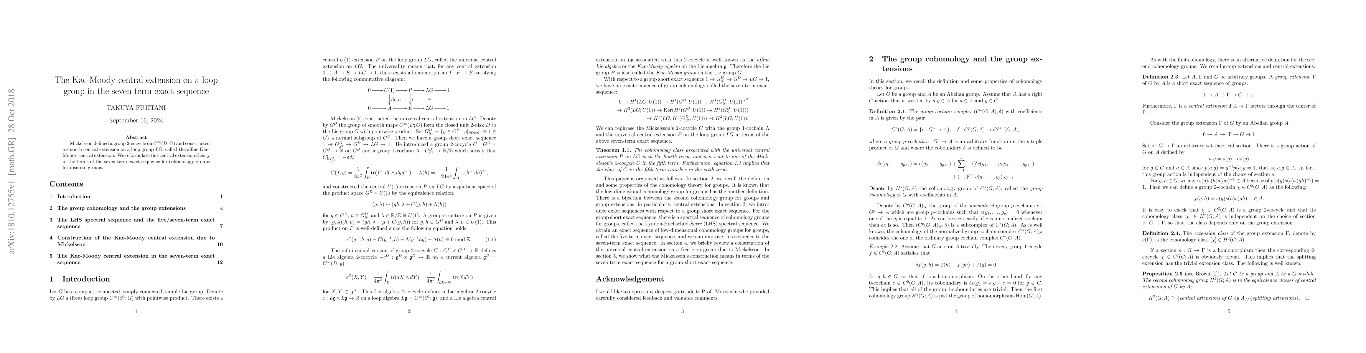 This paper reformulates Mickelsson's construction of the affine Kac-Moody central extension on a loop group in the context of the seven-term exact sequence for cohomology groups of discrete groups. It aims to provide a clearer understanding of the central extension theory through this new perspective.
