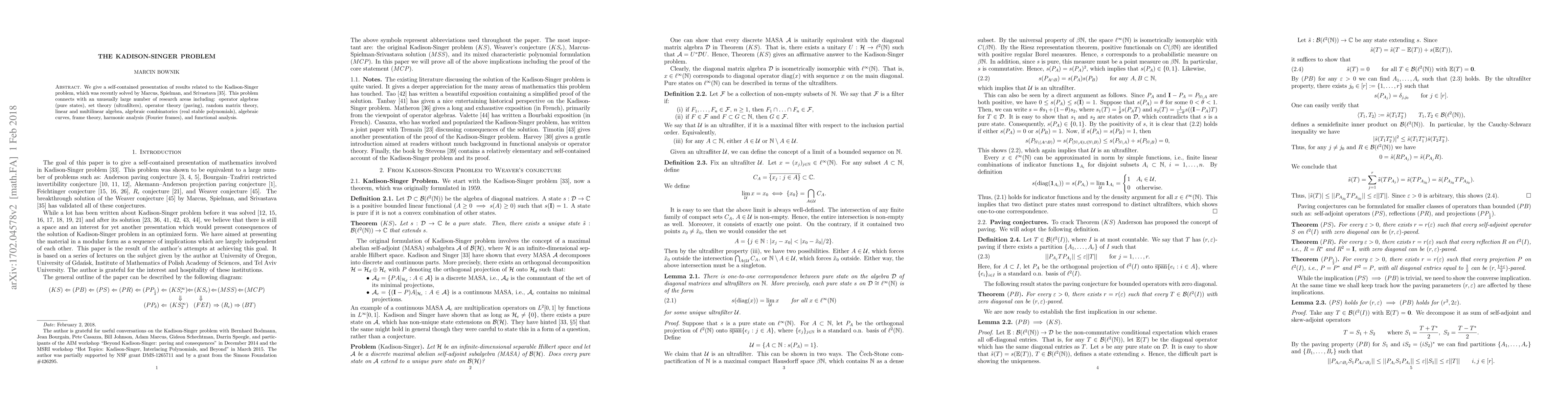 We give self-contained presentation of results related to the Kadison-Singer problem, which was recently solved by Marcus, Spielman, and Srivastava. This problem connects with unusually large number of areas including: operator algebras (pure states), set theory (ultrafilters), operator theory (paving), random matrix theory, linear and multilinear algebra, algebraic combinatorics (real stable polynomials), algebraic curves, frame theory, harmonic analysis (Fourier frames), and functional analysis.