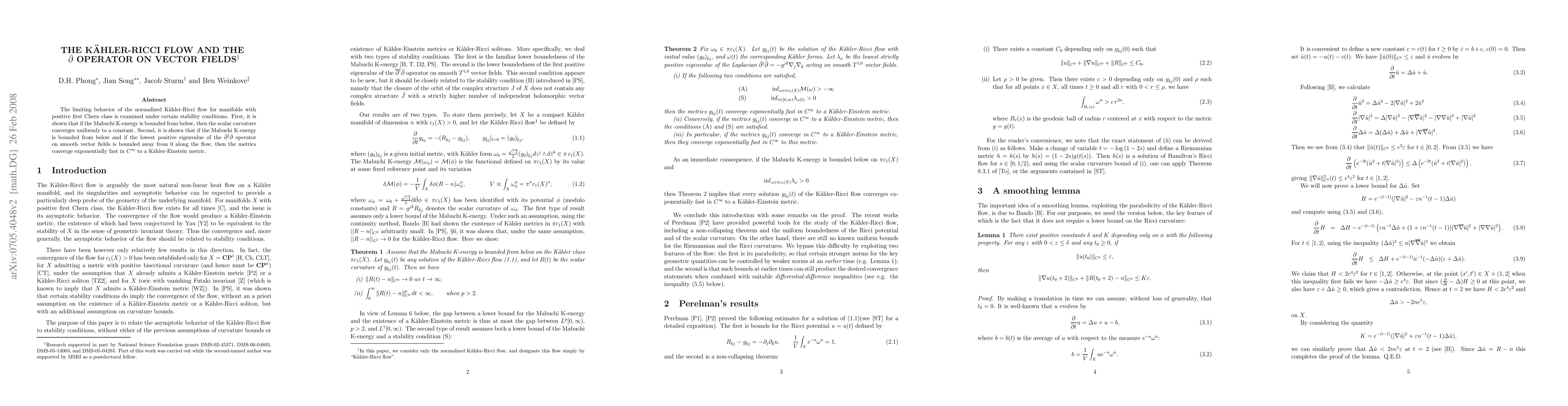 The limiting behavior of the normalized K\"ahler-Ricci flow for manifolds with positive first Chern class is examined under certain stability conditions. First, it is shown that if the Mabuchi K-energy is bounded from below, then the scalar curvature converges uniformly to a constant. Second, it is shown that if the Mabuchi K-energy is bounded from below and if the lowest positive eigenvalue of the $\bar\partial^\dagger \bar\partial$ operator on smooth vector fields is bounded away from 0 along the flow, then the metrics converge exponentially fast in $C^\infty$ to a K\"ahler-Einstein metric.