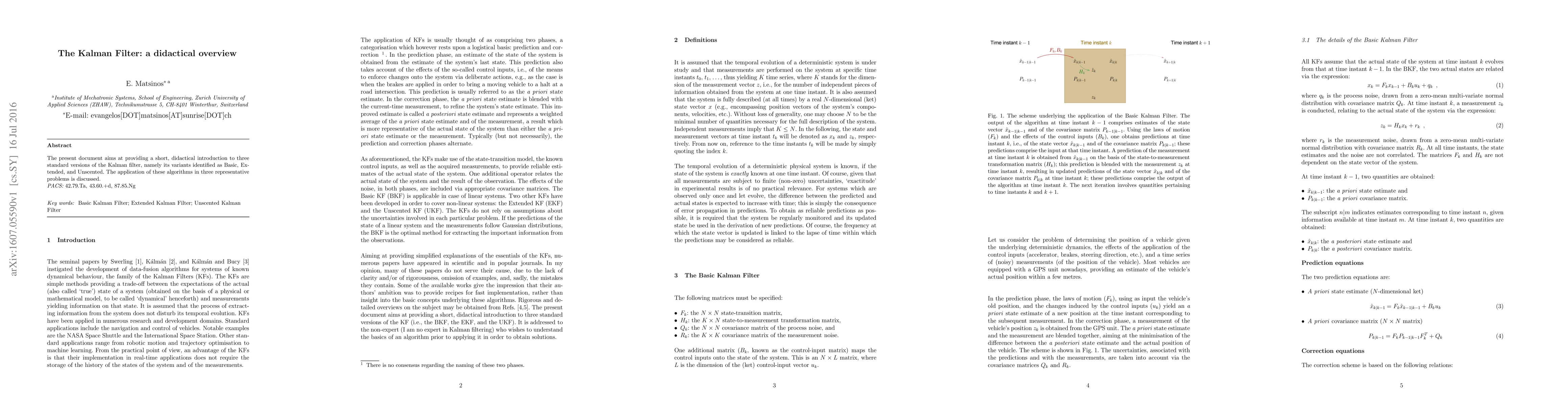 The present document aims at providing a short, didactical introduction to three standard versions of the Kalman filter, namely its variants identified as Basic, Extended, and Unscented. The application of these algorithms in three representative problems is discussed.