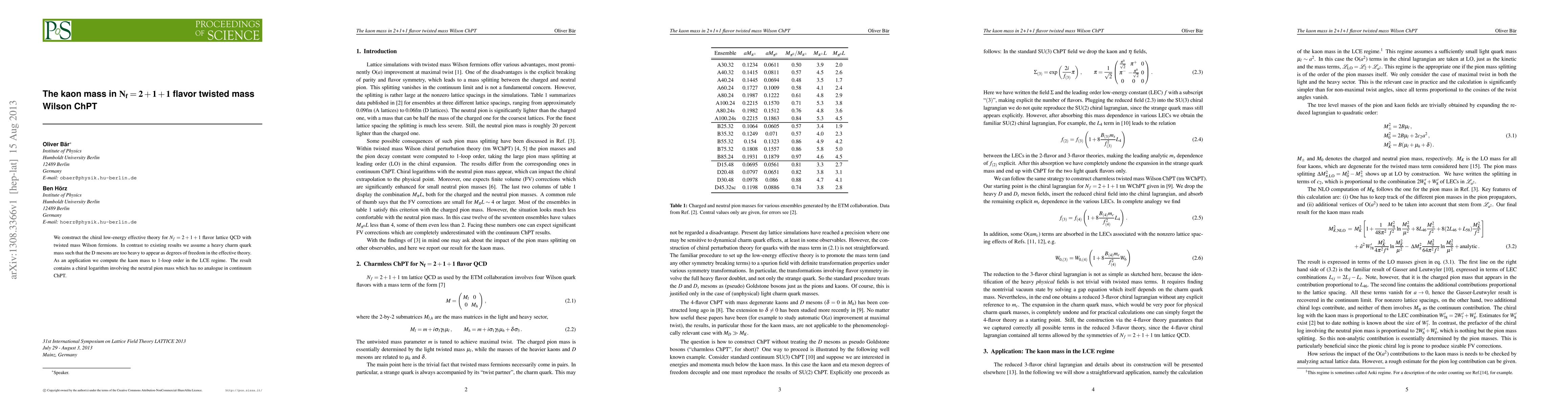 This paper develops a chiral low-energy effective theory for 2+1+1 flavor lattice QCD using twisted mass Wilson fermions, focusing on a heavy charm quark scenario. The study computes the kaon mass to 1-loop order, revealing a unique chiral logarithm involving the neutral pion mass not found in continuum ChPT.