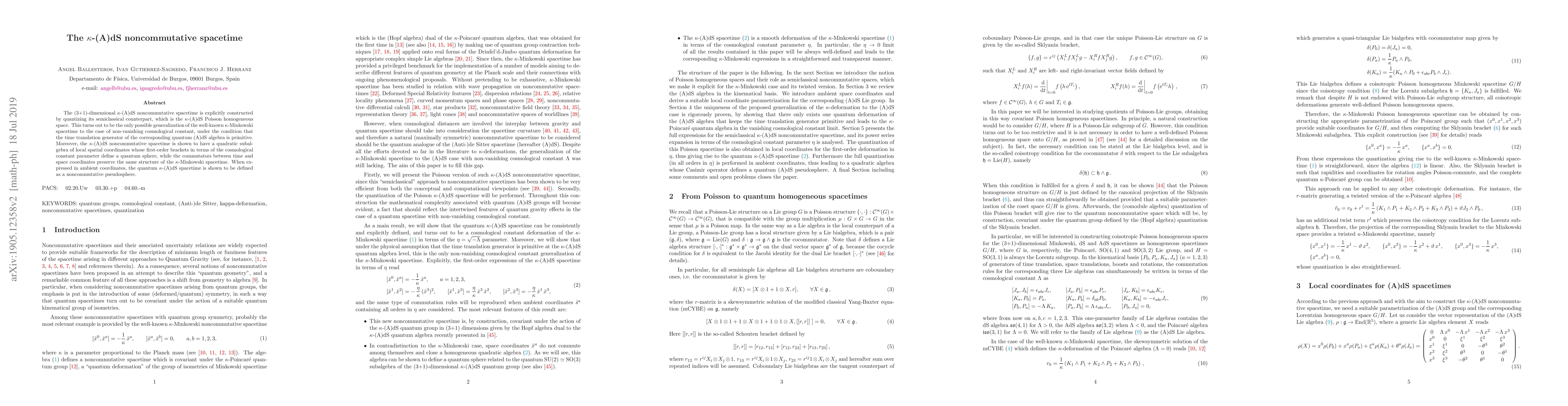 The research constructs a (3+1)-dimensional $\kappa$-(A)dS noncommutative spacetime by quantizing its semiclassical counterpart, revealing it as a quantum sphere with a preserved structure from $\kappa$-Minkowski spacetime, and defining it as a noncommutative pseudosphere in ambient coordinates.
