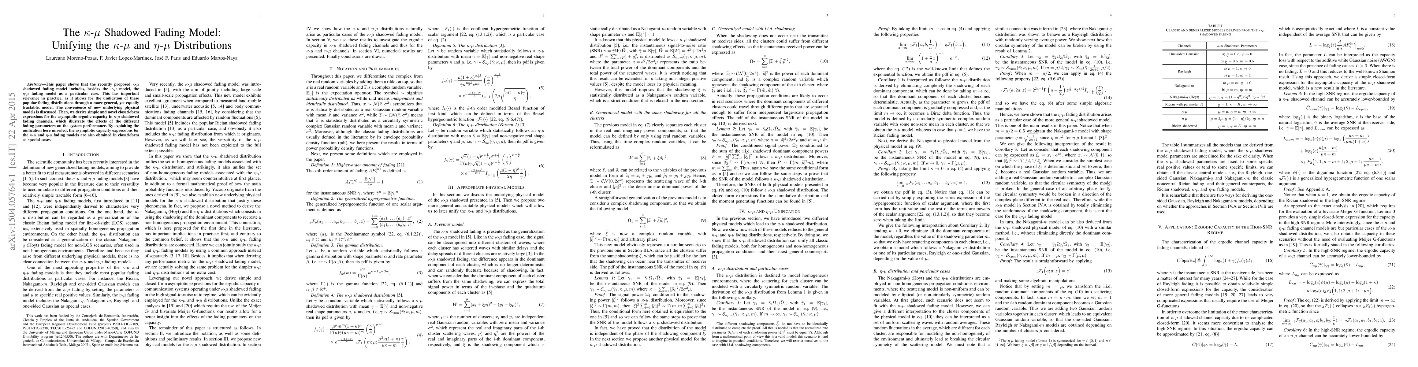This paper shows that the recently proposed $\kappa$-$\mu$ shadowed fading model includes, besides the $\kappa$-$\mu$ model, the $\eta$-$\mu$ fading model as a particular case. This has important relevance in practice, as it allows for the unification of these popular fading distributions through a more general, yet equally tractable, model. The convenience of new underlying physical models is discussed. Then, we derive simple and novel closed-form expressions for the asymptotic ergodic capacity in $\kappa$-$\mu$ shadowed fading channels, which illustrate the effects of the different fading parameters on the system performance. By exploiting the unification here unveiled, the asymptotic capacity expressions for the $\kappa$-$\mu$ and $\eta$-$\mu$ fading models are also obtained in closed-form as special cases.