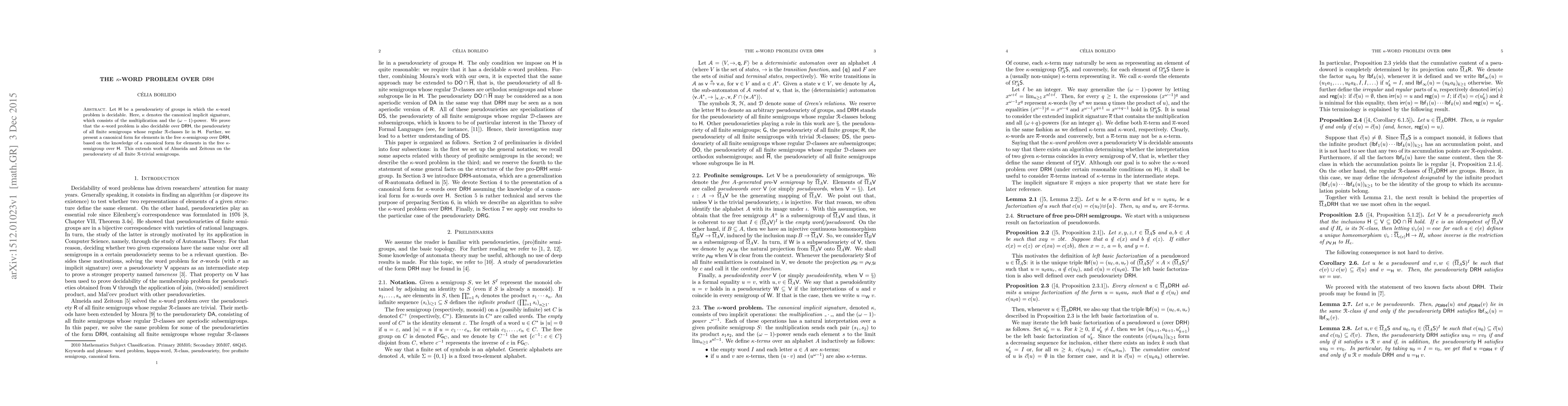 Let H be a pseudovariety of groups in which the kappa-word problem is decidable. Here, kappa denotes the canonical implicit signature, which consists of the multiplication and the (omega-1)-power. We prove that the kappa-word problem is also decidable over DRH, the pseudovariety of all finite semigroups whose regular R-classes lie in H. Further, we present a canonical form for elements in the free kappa-semigroup over DRH, based on the knowledge of a canonical form for elements in the free kappa-semigroup over H. This extends work of Almeida and Zeitoun on the pseudovariety of all finite R-trivial semigroups.