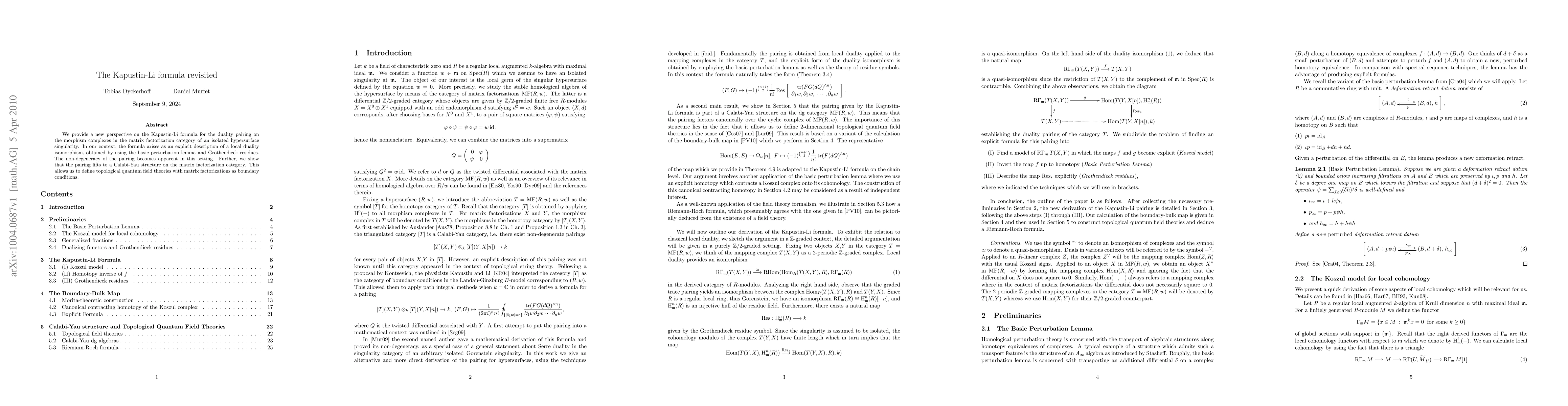 This paper revisits the Kapustin-Li formula for duality pairing in matrix factorizations, presenting it as a local duality isomorphism via the basic perturbation lemma and Grothendieck residues, and shows its non-degeneracy. It further extends the pairing to a Calabi-Yau structure, enabling the definition of topological quantum field theories with matrix factorizations as boundary conditions.