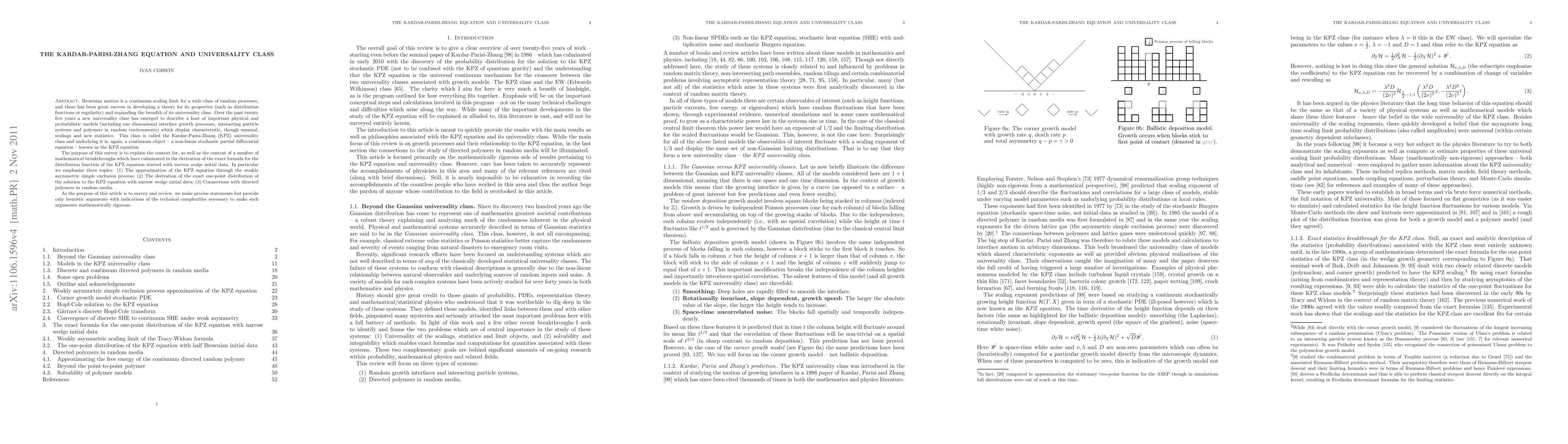 This paper surveys significant advancements in the understanding of the Kardar-Parisi-Zhang (KPZ) universality class, focusing on the KPZ equation's exact distribution function derivation from narrow wedge initial data. It highlights the link between the KPZ equation and the weakly asymmetric simple exclusion process, and explores connections with directed polymers in random media.