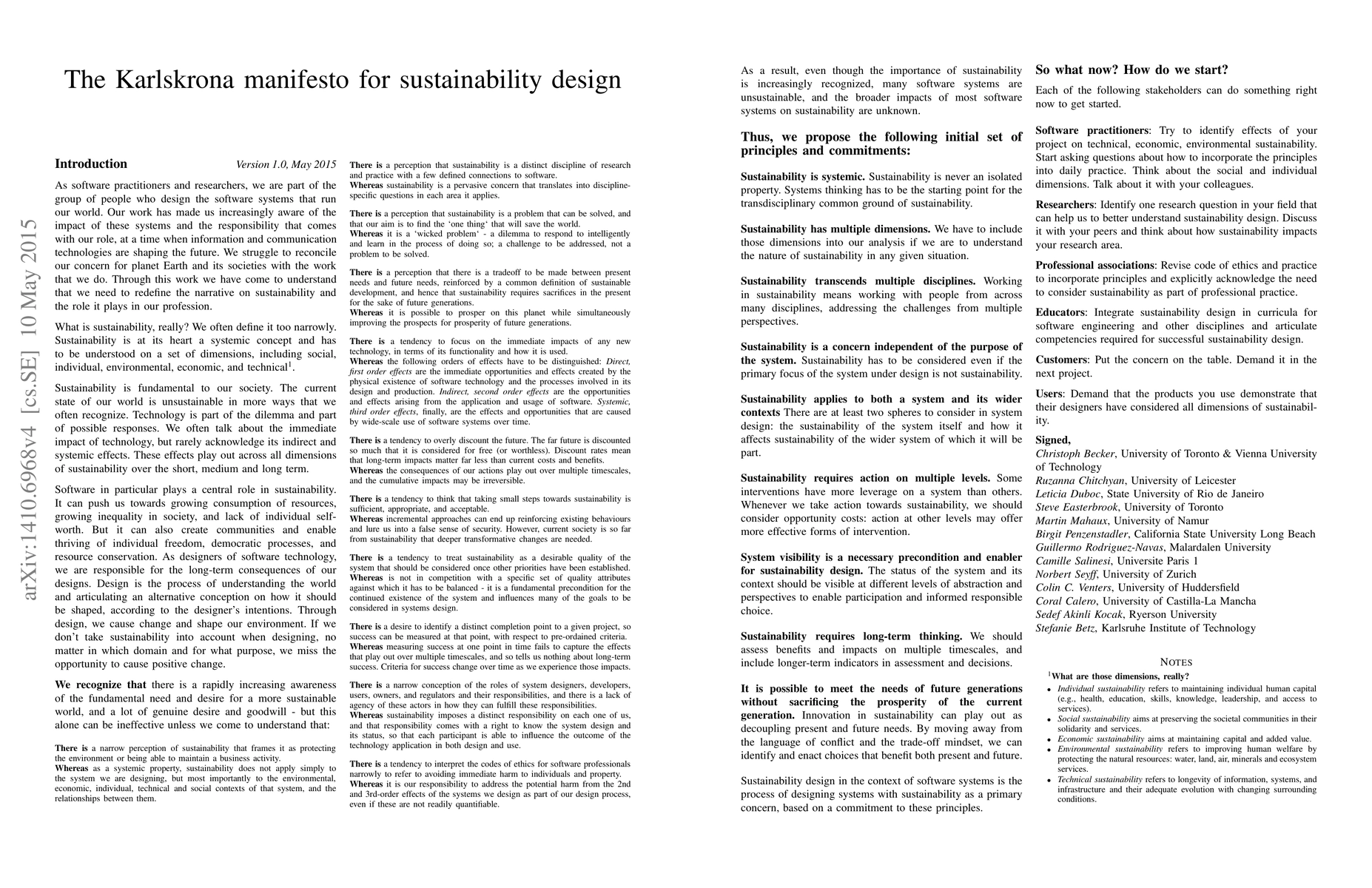 The Karlskrona Manifesto for Sustainability Design calls for a critical examination of misperceptions in software design to foster genuine sustainability, emphasizing the responsibility of designers to promote eco-friendly practices and proposing fundamental principles to guide sustainable design efforts.