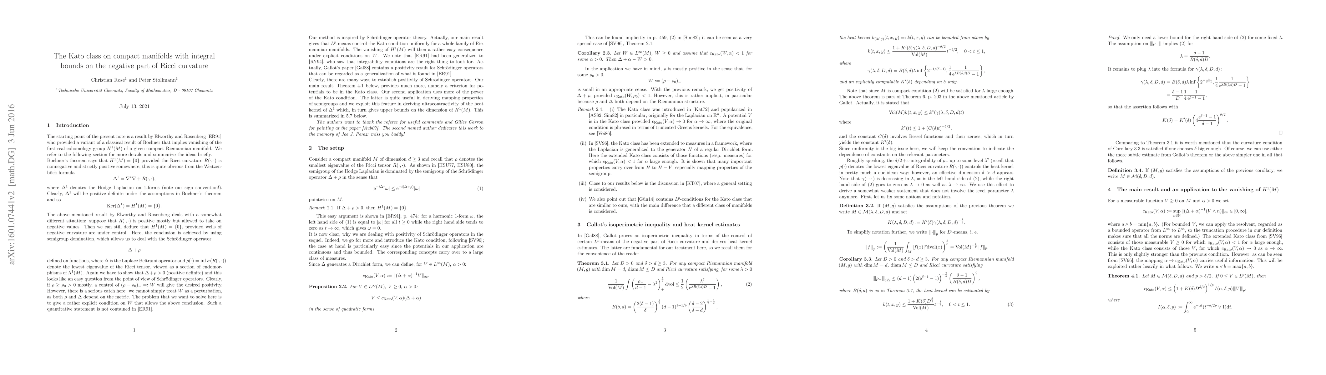 Summary: This paper demonstrates that under integral bounds on the Ricci curvature, the dimension of the first cohomology group can be estimated using the Kato constant of the negative Ricci curvature, providing quantitative insights that differ from previous results by Elworthy and Rosenberg.