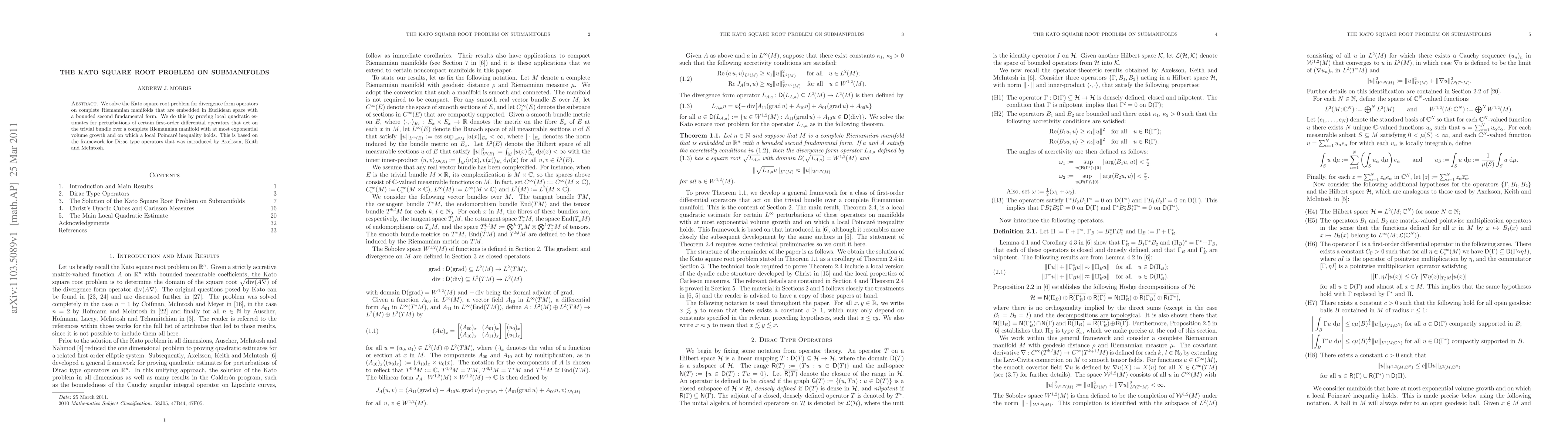 The paper solves the Kato square root problem for divergence form operators on complete Riemannian submanifolds with bounded second fundamental form, using local quadratic estimates for perturbations of first-order differential operators, building on the framework developed by Axelsson, Keith, and McIntosh.