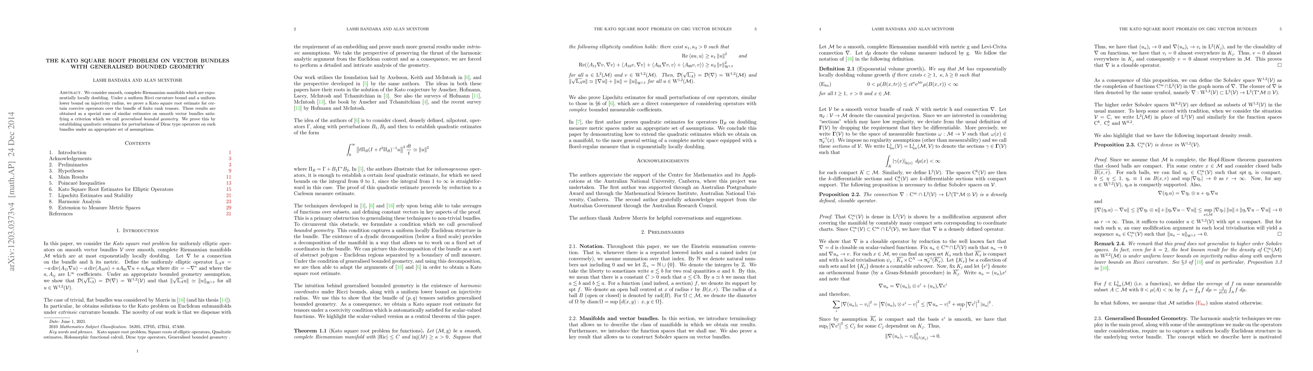 We consider smooth, complete Riemannian manifolds which are exponentially locally doubling. Under a uniform Ricci curvature bound and a uniform lower bound on injectivity radius, we prove a Kato square root estimate for certain coercive operators over the bundle of finite rank tensors. These results are obtained as a special case of similar estimates on smooth vector bundles satisfying a criterion which we call generalised bounded geometry. We prove this by establishing quadratic estimates for perturbations of Dirac type operators on such bundles under an appropriate set of assumptions.