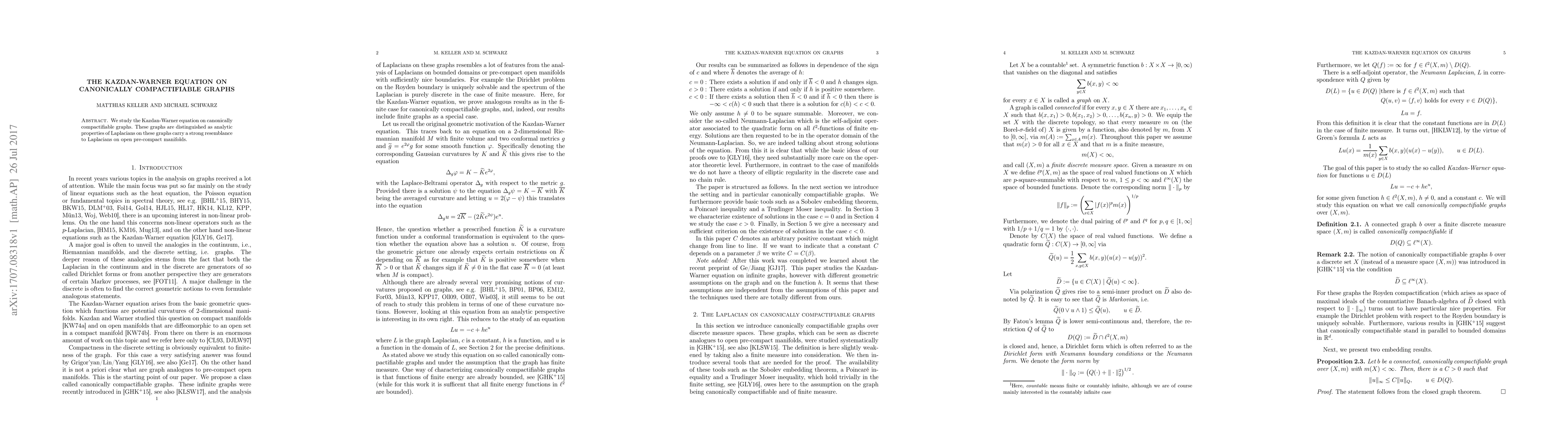The paper investigates the Kazdan-Warner equation on canonically compactifiable graphs, demonstrating that their analytic properties closely resemble those of Laplacians on open pre-compact manifolds. This provides a bridge between graph theory and differential geometry.