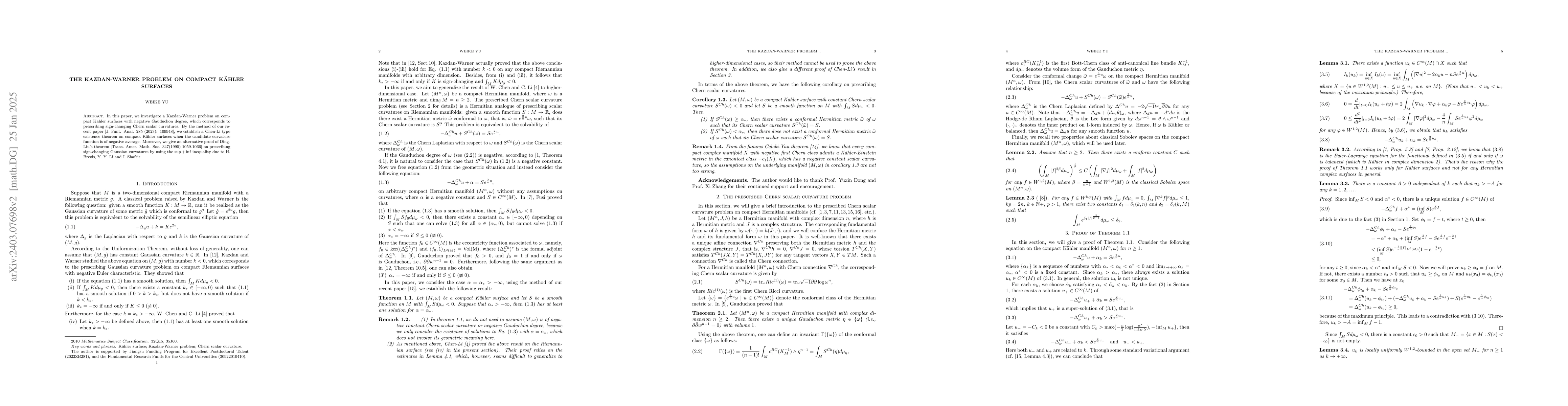 This paper addresses the Kazdan-Warner problem on compact Kähler surfaces with negative Gauduchon degree, establishing an existence theorem for sign-changing Chern scalar curvatures using methods from a prior work, and providing an alternative proof for prescribing sign-changing Gaussian curvatures via the $\sup+\inf$ inequality.